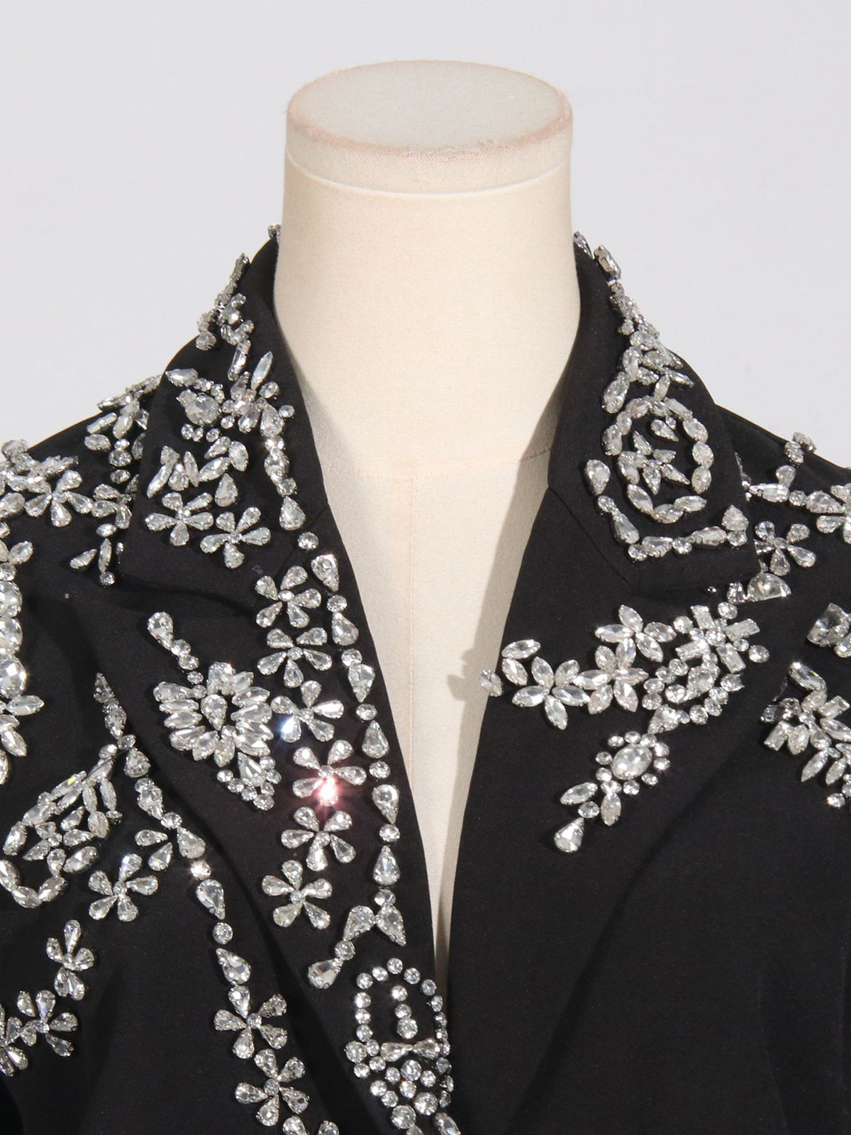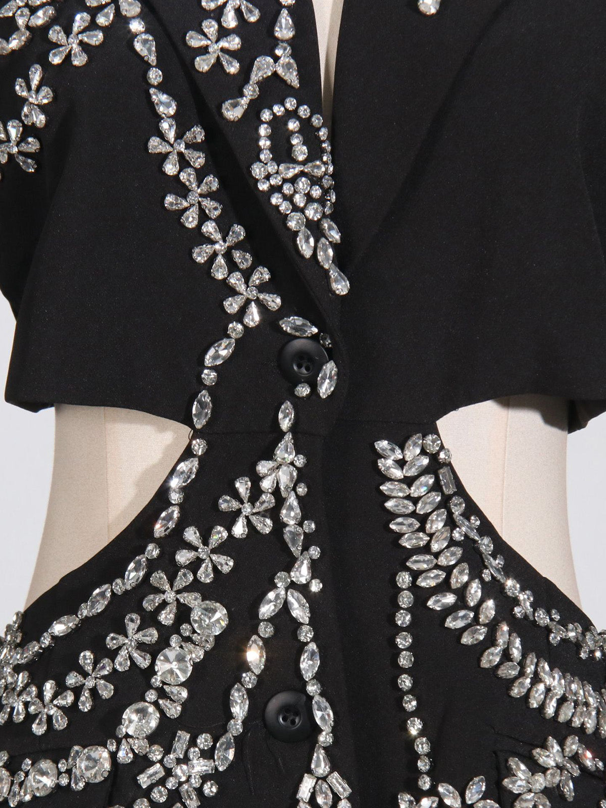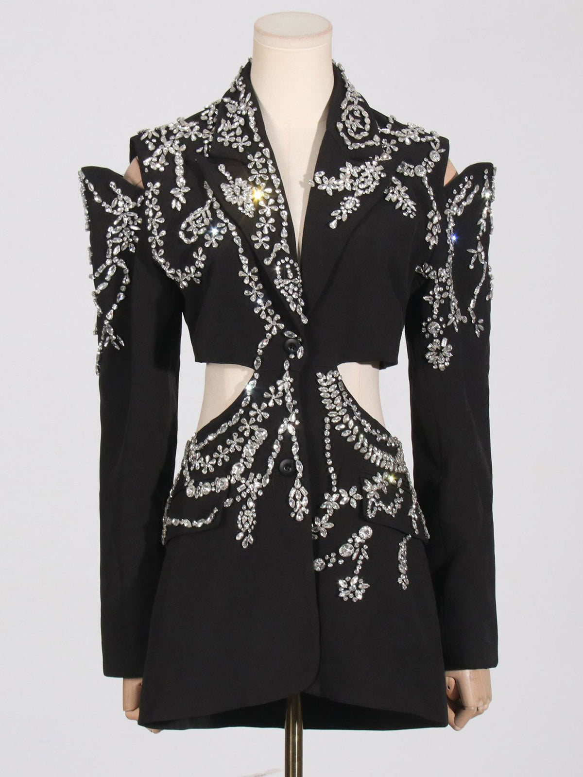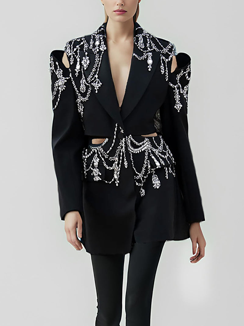 Elevate your wholesale collection with this striking rhinestone-embellished cutout blazer. Featuring strategic cutout details and sparkling rhinestone accents, this piece delivers contemporary style with upscale appeal. The tailored silhouette flatters various body types, making it a versatile addition to boutique inventories. Perfect for customers seeking statement outerwear that transitions seamlessly from day to evening wear. High-quality construction ensures durability through repeated wear and cleaning cycles. Ideal for retailers targeting fashion-forward clientele who appreciate bold design elements and premium finishes.