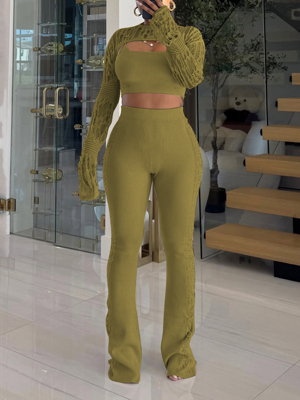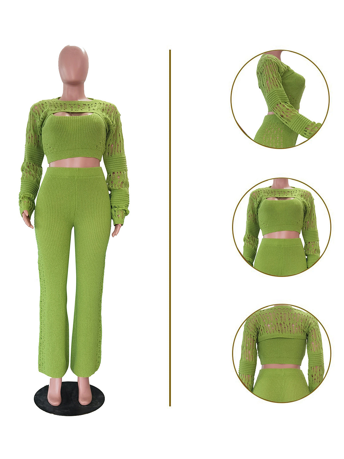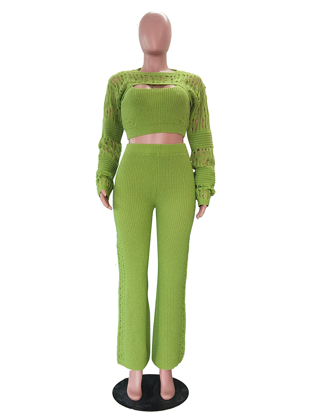 This Casual Knit Hollow Out Three Piece Set offers a stylish and comfortable outfit choice. Featuring breathable knit fabric with tasteful hollow-out details, it provides both ventilation and a modern look. The coordinated three-piece design makes it easy to mix and match for versatile wear, ideal for retail buyers seeking fashionable and practical sets for their customers.