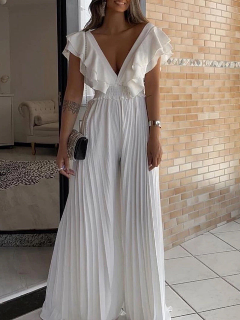 Elegant V Neck Ruffle Pleated Wide Leg Jumpsuit
