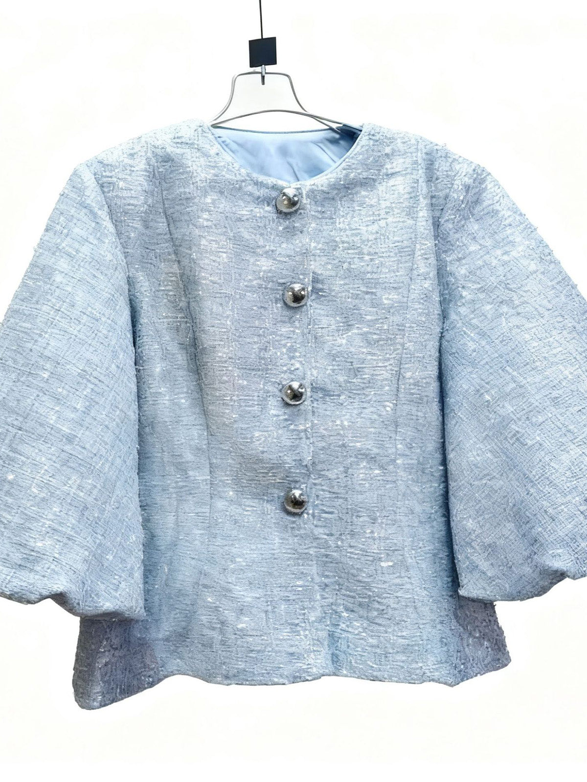 # Fashion Metallic Tweed Peplum Jacket Elevate your wholesale collection with this sophisticated metallic tweed peplum jacket....
