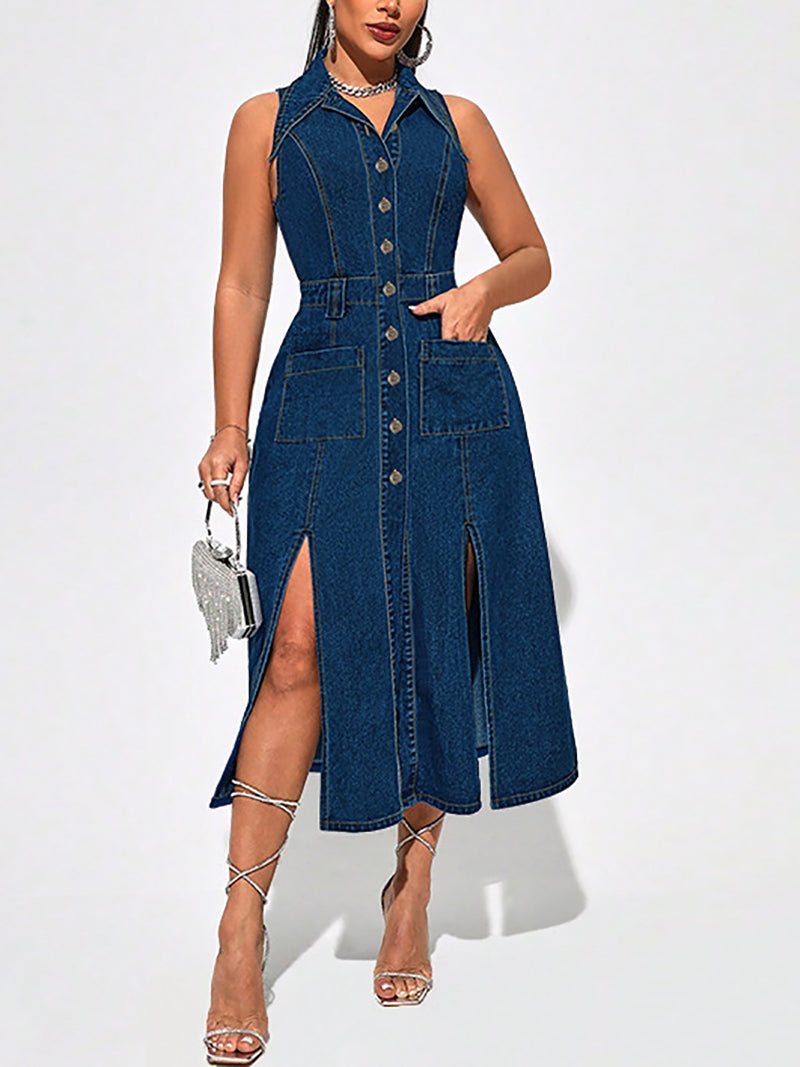 This fashionable, single-breasted, sleeveless denim dress features a side slit for added style and versatility. Made with high-quality denim material, this dress is perfect for any occasion, from casual to dressy. Elevate your wardrobe with this must-have piece.