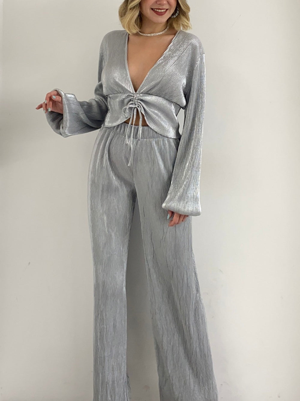 Look stylish and feel comfortable in our Fashion V-Neck Top Wide Leg Trousers Two Piece Set. The trendy design allows for maximum versatility while the comfortable fabric ensures all-day wearability. Perfect for wholesalers looking for high profit margins.