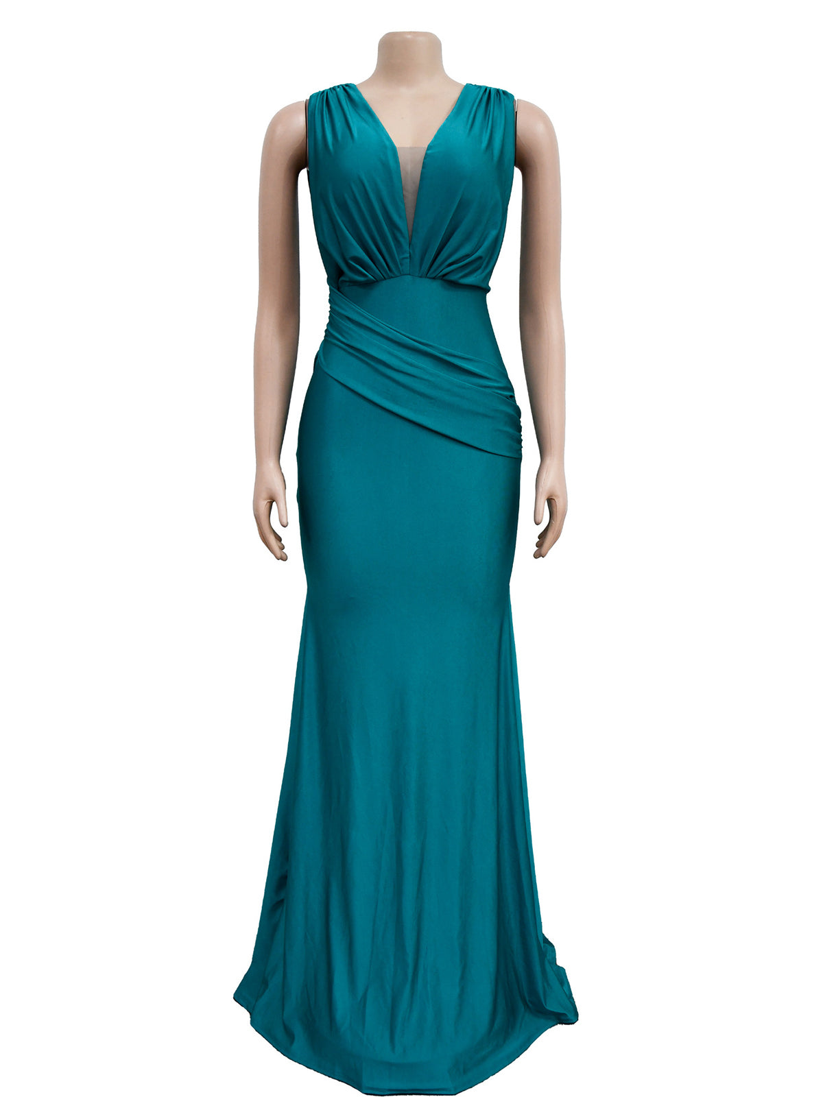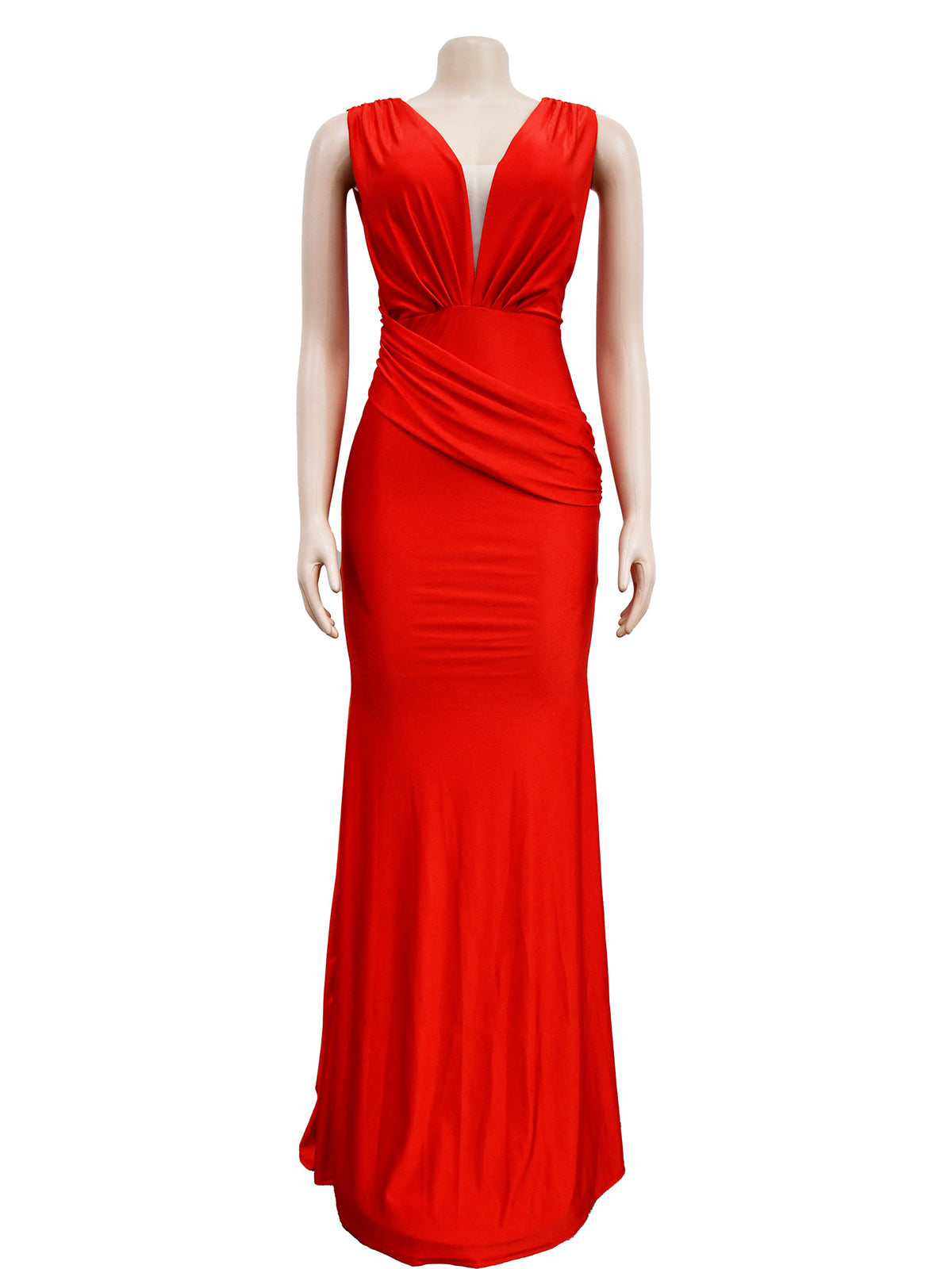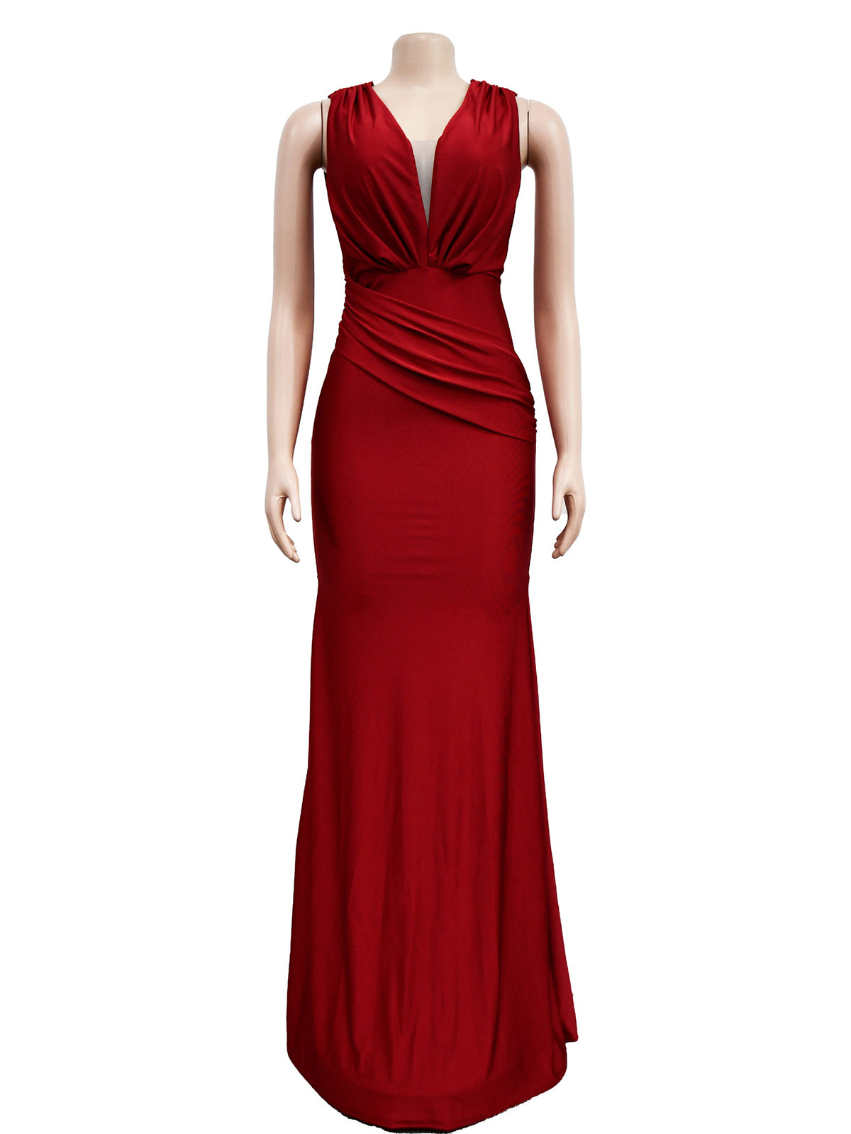 Sexy Deep V-Neck Sleeveless Pleated Fishtail Dress