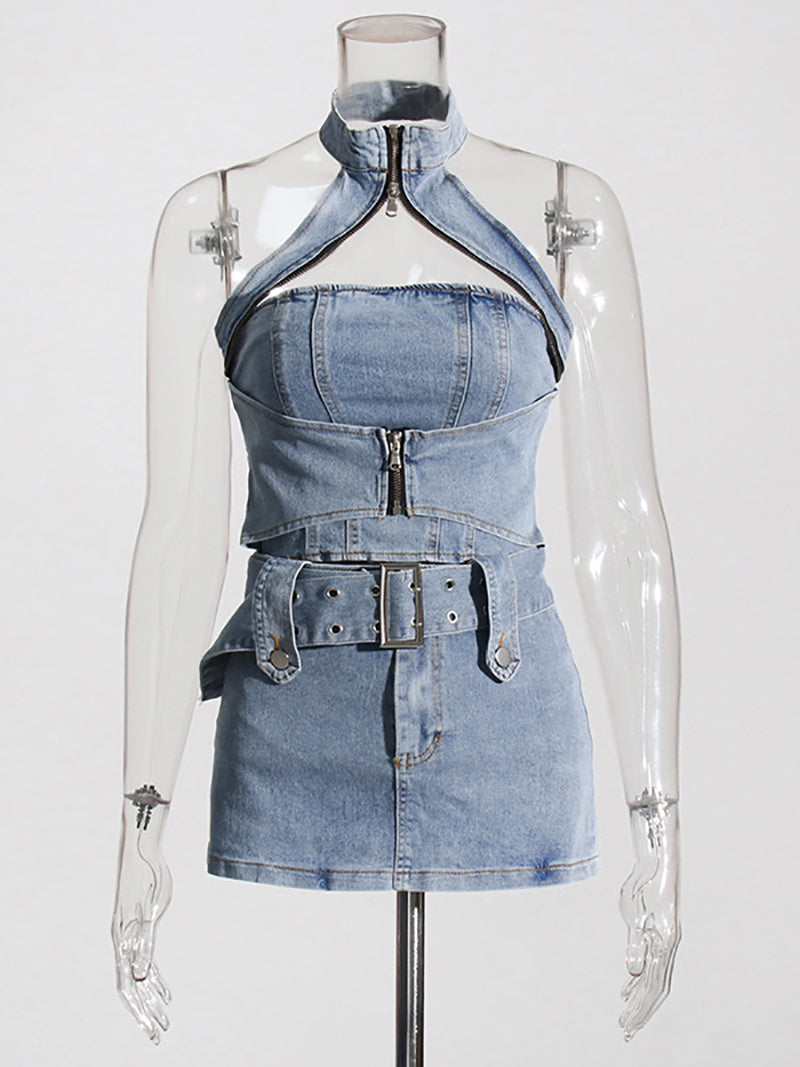 Sexy Halter Off-Shoulder Denim Skirt Set