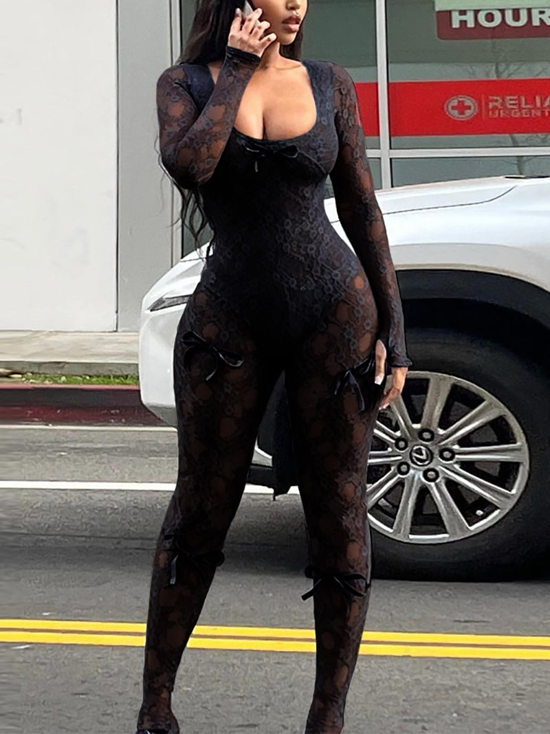 This Sexy Lace Bow See Through Jumpsuit is perfect for adding a touch of personality to your wardrobe. The delicate lace and bow details create a playful yet elegant look, perfect for any occasion.