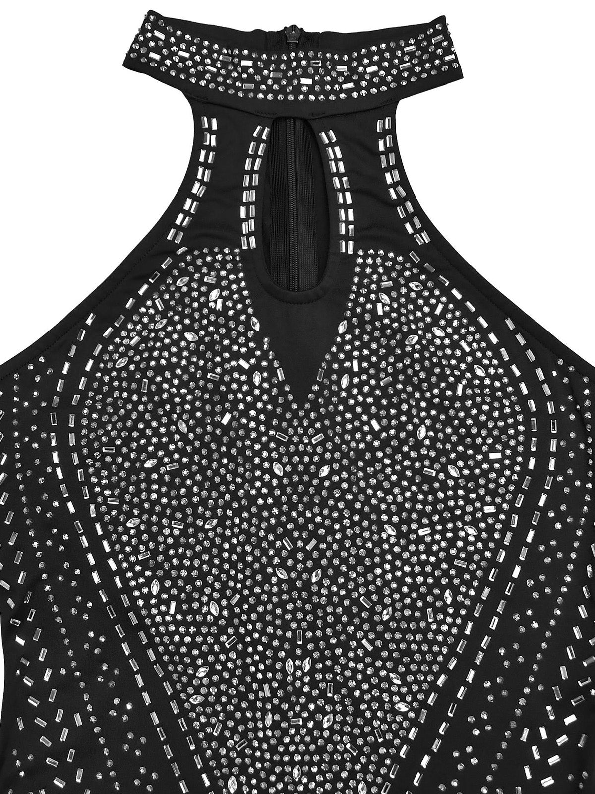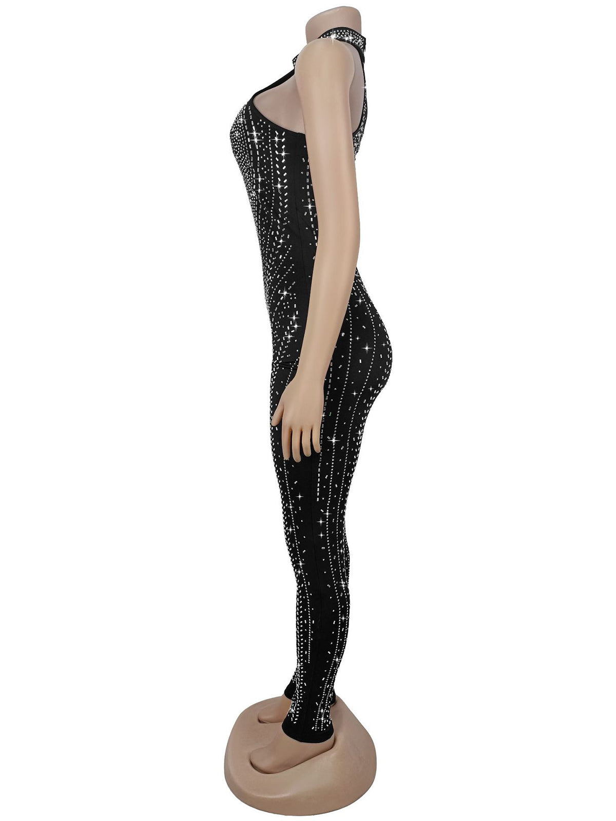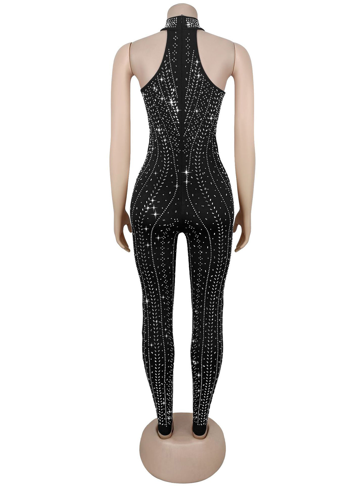 This sleeveless jumpsuit features a sexy mesh design adorned with sparkling rhinestones, perfect for making a bold statement. Its breathable fabric ensures comfort while the embellished details add a touch of glamour, ideal for events and nightlife. A stylish choice for retailers seeking to offer trendy and eye-catching party wear.