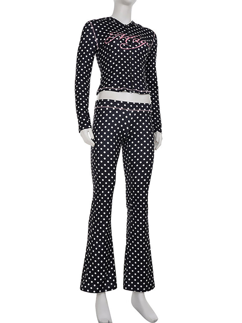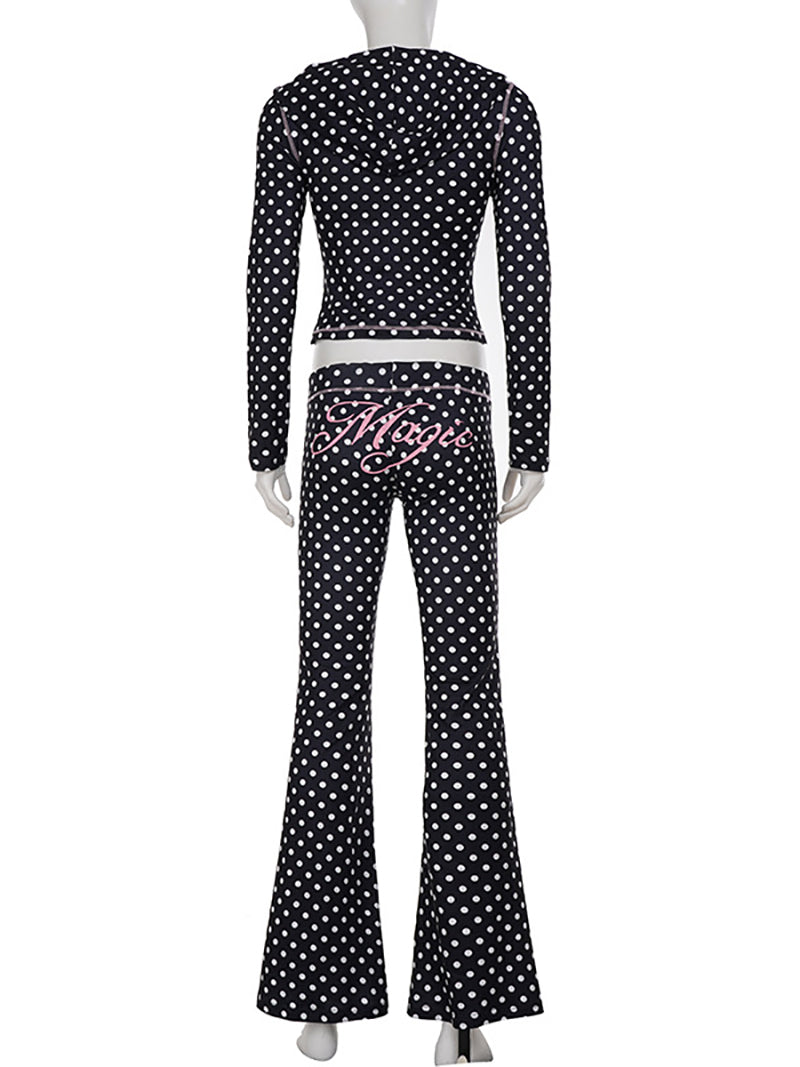 This set features a sexy polka dot hooded cropped top paired with flare pants, combining trendy style and comfort. Ideal for wholesale buyers seeking fashionable, coordinated outfits that appeal to a wide audience. The breathable fabric and flattering fit make it perfect for casual outings or social events. Elevate your inventory with this stylish and versatile two-piece set.