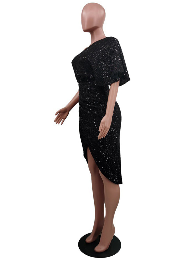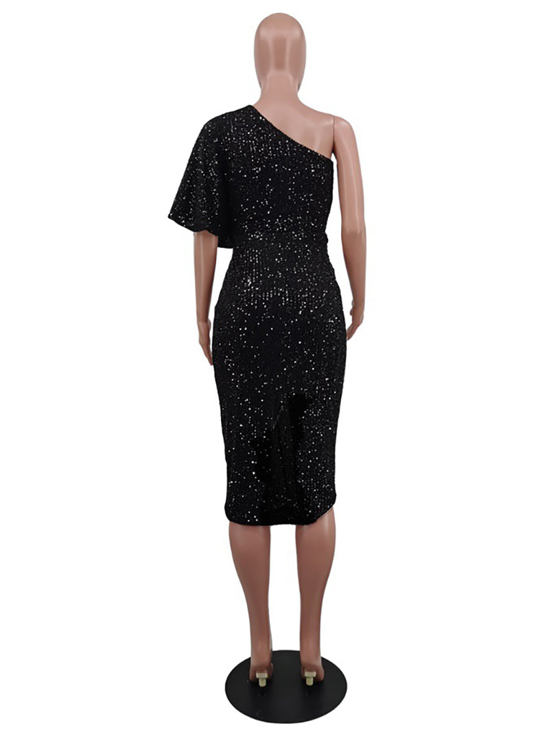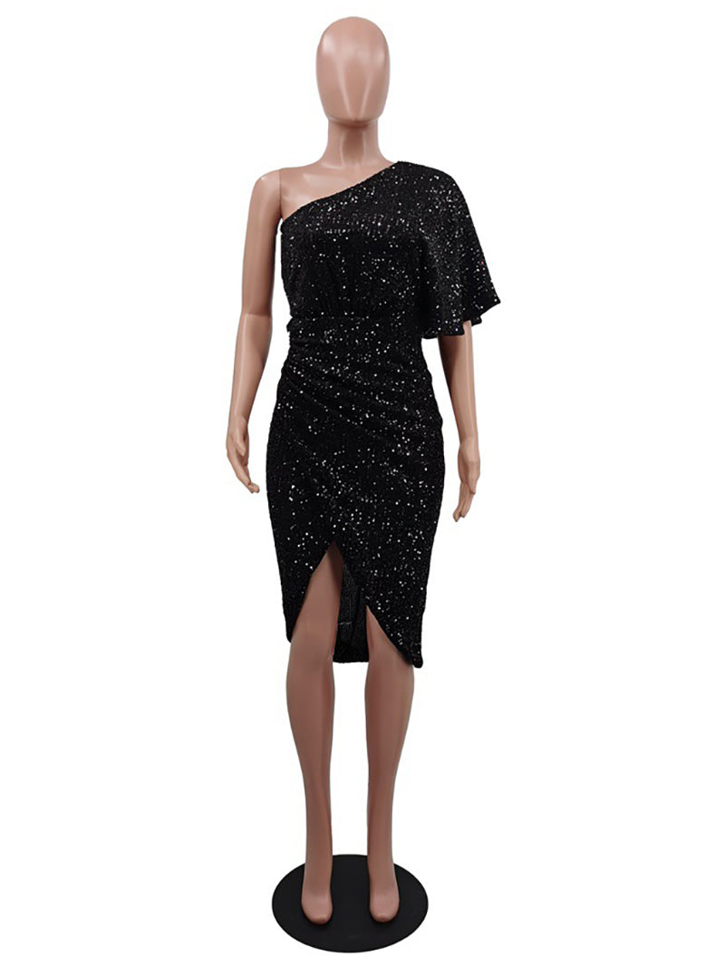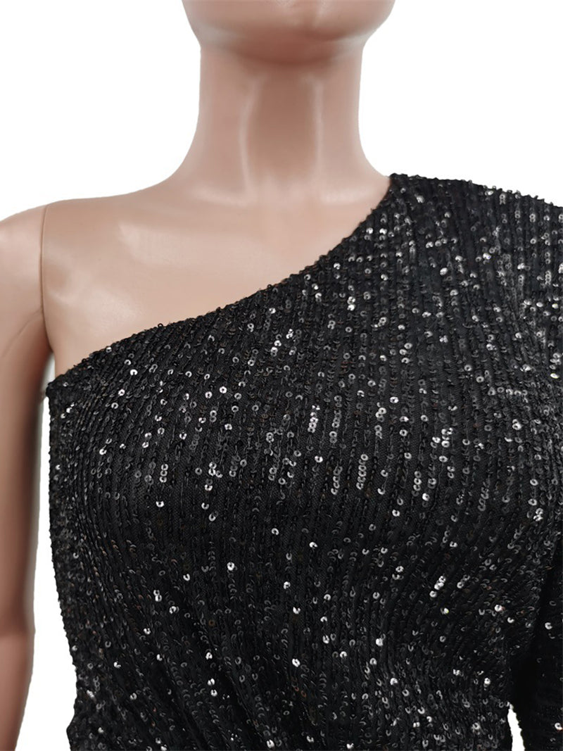 # Sexy Sequin One Shoulder Party Club Dress Make a bold statement in this eye-catching sequin dress featuring a striking one-shoulder design. The shimmering sequin fabric catches light beautifully, creating an alluring sparkle perfect for nightlife and special occasions. The asymmetrical neckline adds modern sophistication while the fitted silhouette flatters your figure. Ideal for club nights, parties, and events where you want to stand out. This dress combines glamour with contemporary style for the confident wearer.