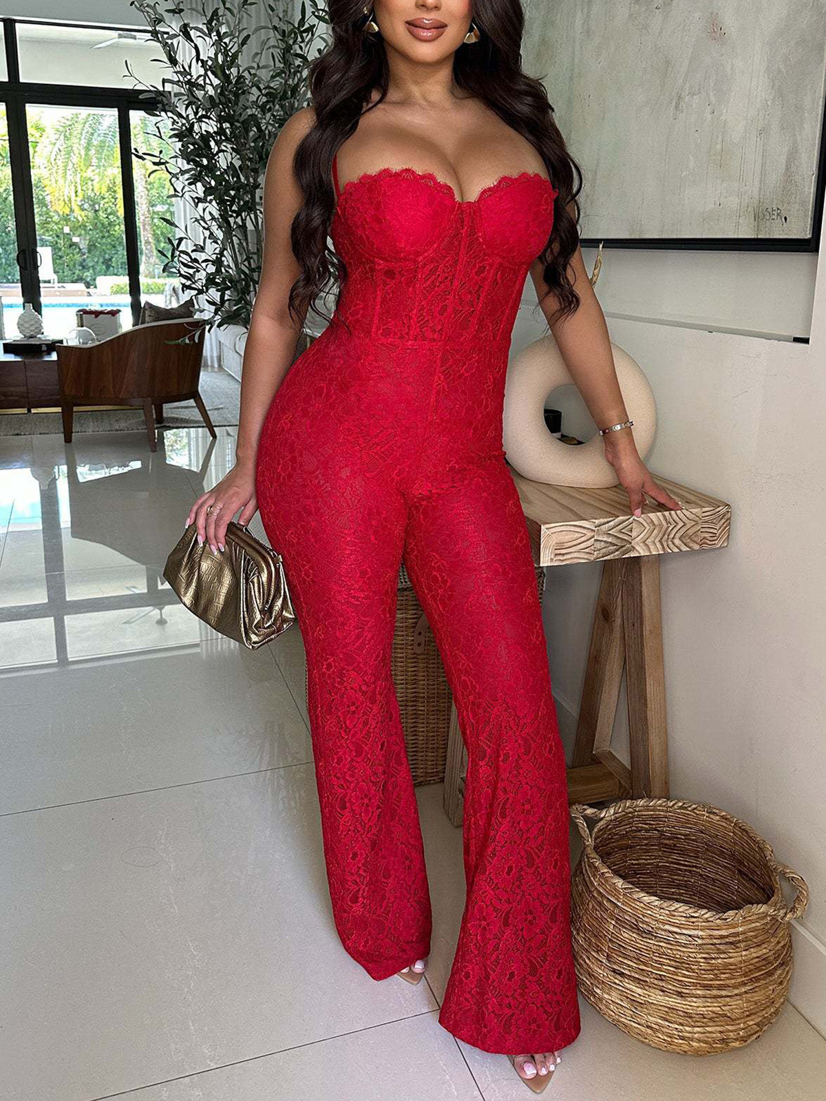 Elevate your style with our sexy spaghetti strap slim jumpsuit featuring delicate lace detailing. This jumpsuit will accentuate your curves and make you feel confident and beautiful. Perfect for a night out or special occasion. Comes in multiple colors.
