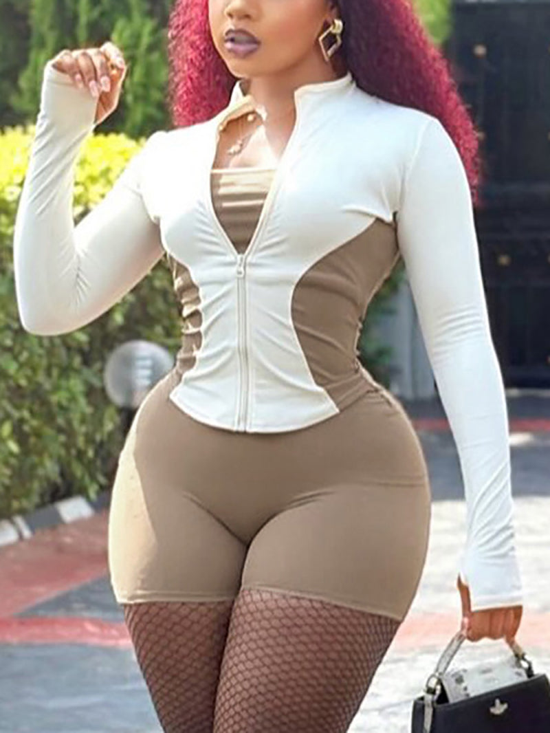 Stand Collar Contrast Color Slim Top Skinny Shorts Sets