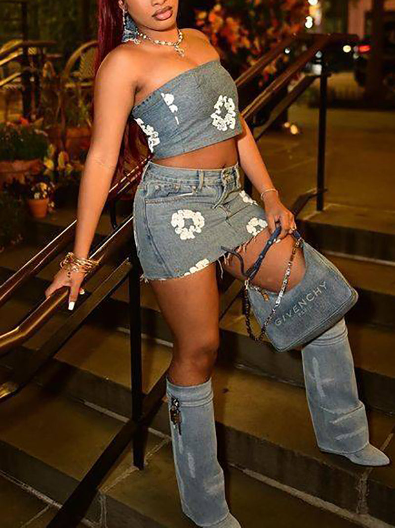 This two piece set features a strapless floral print denim skirt that exudes sexiness. The high quality material offers a great value, making it a profitable choice for wholesalers.