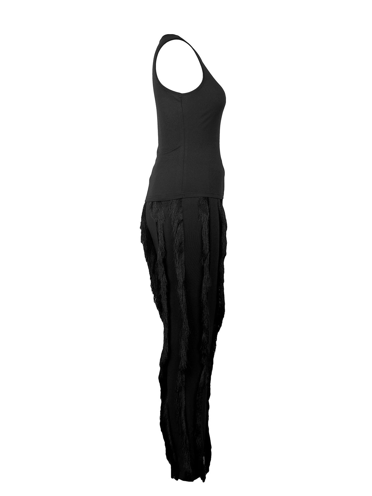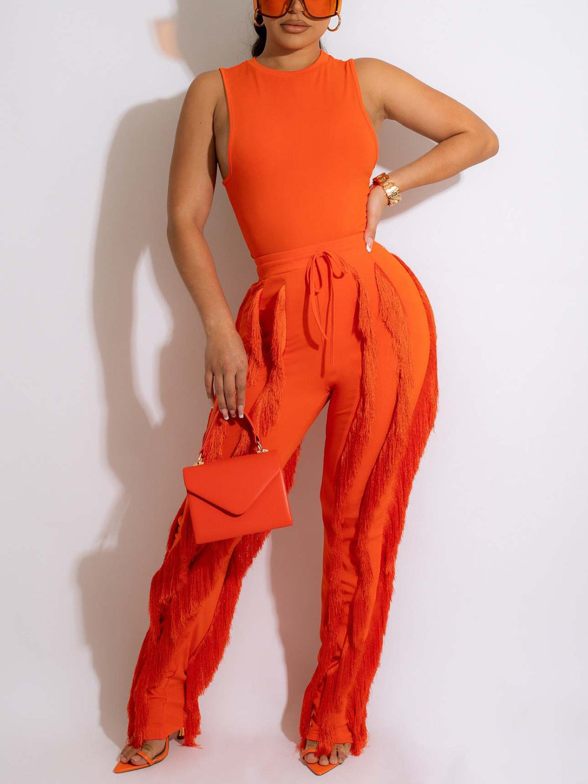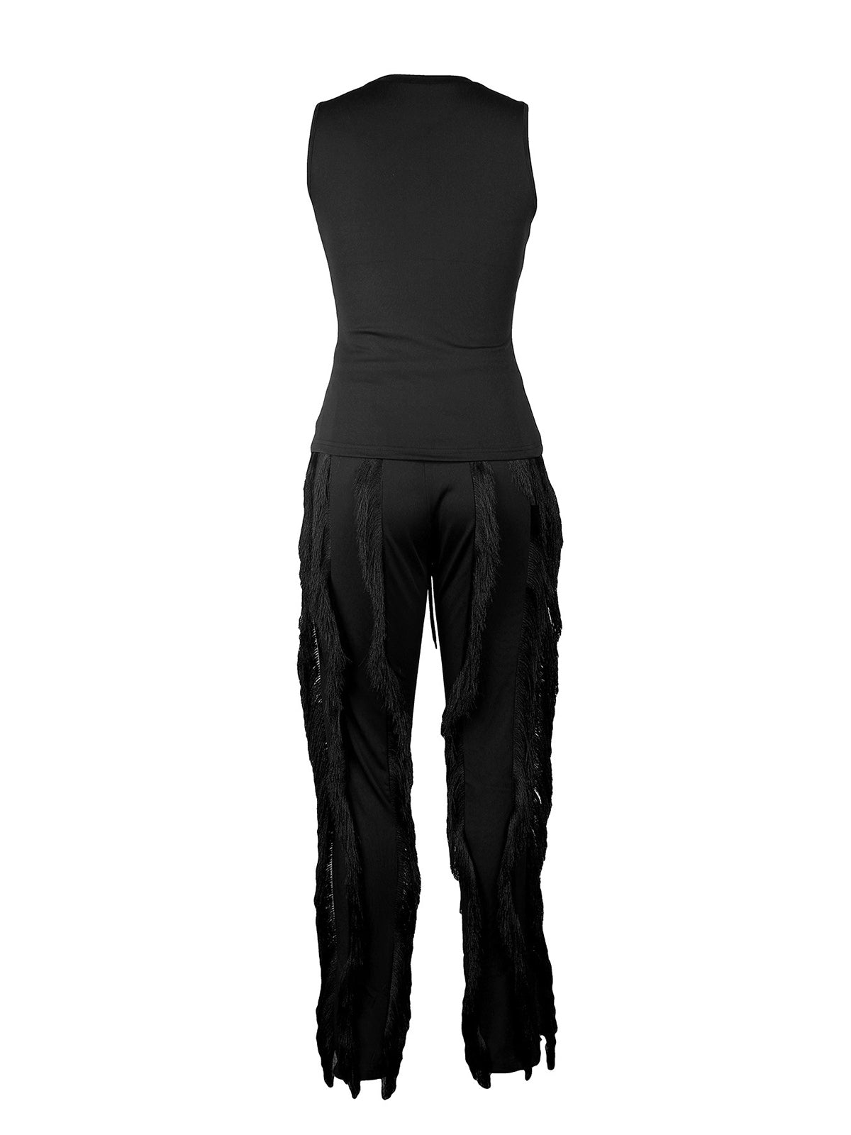 # Casual Sleeveless Bodysuit Tassels Pants Set This versatile two-piece set combines a sleek sleeveless bodysuit with coordinating tassel-detailed pants, perfect for wholesale buyers seeking trendy, mix-and-match pieces. The bodysuit offers a fitted silhouette that works as a standalone top or layering piece, while the pants feature eye-catching tassel accents for added visual interest. Ideal for retailers looking to stock contemporary casual wear that appeals to fashion-forward customers. Quality construction ensures durability through repeated wear and washing, making this set a reliable addition to any inventory.