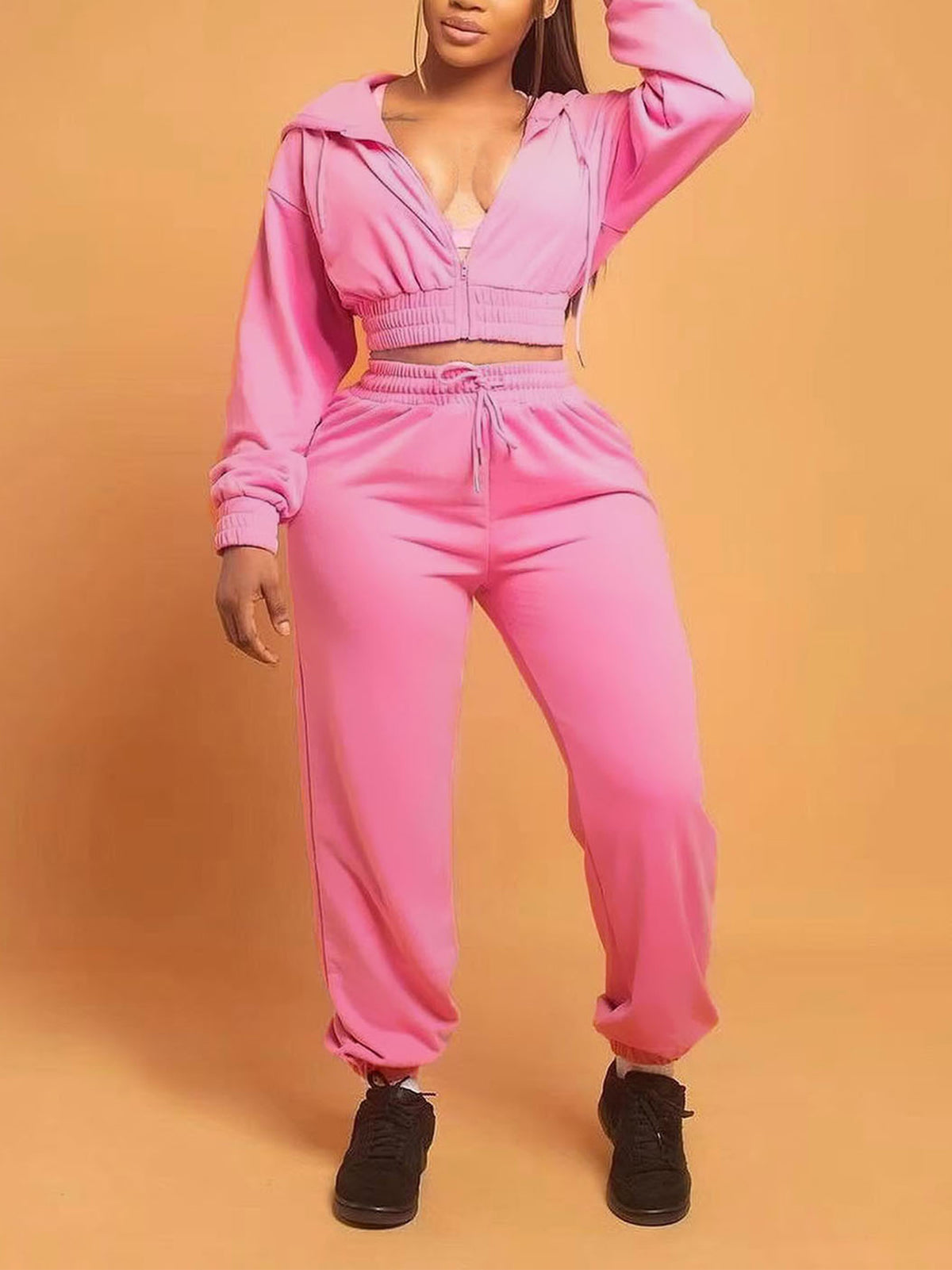 Casual Zipper Cropped Hoodie Sports Two Piece Set