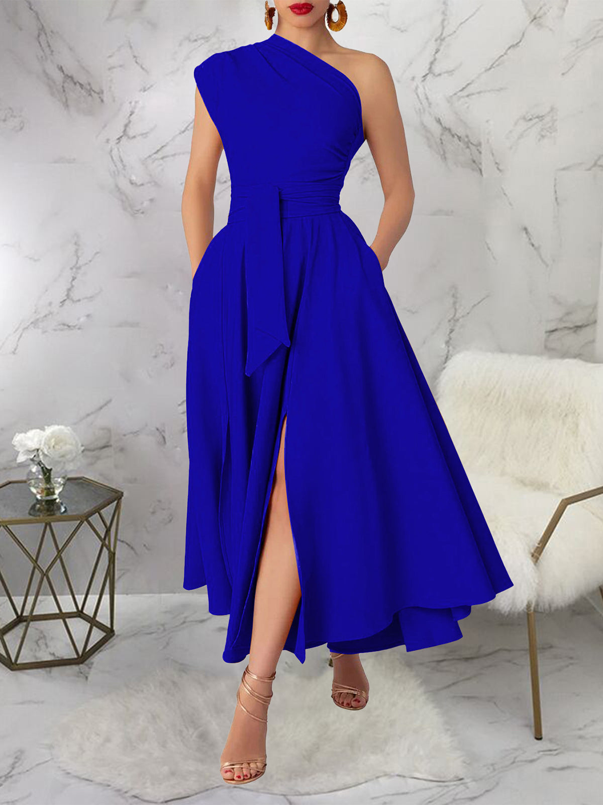 This Elegant One Shoulder Pleated Party Maxi Split Dress features a sophisticated design perfect for special occasions. The pleated fabric adds texture and flow, while the one-shoulder style brings a modern, chic touch. A high split enhances movement and allure, making it an ideal choice for formal events or evening parties. This dress combines elegance with comfort, appealing to customers seeking upscale fashion at wholesale prices.