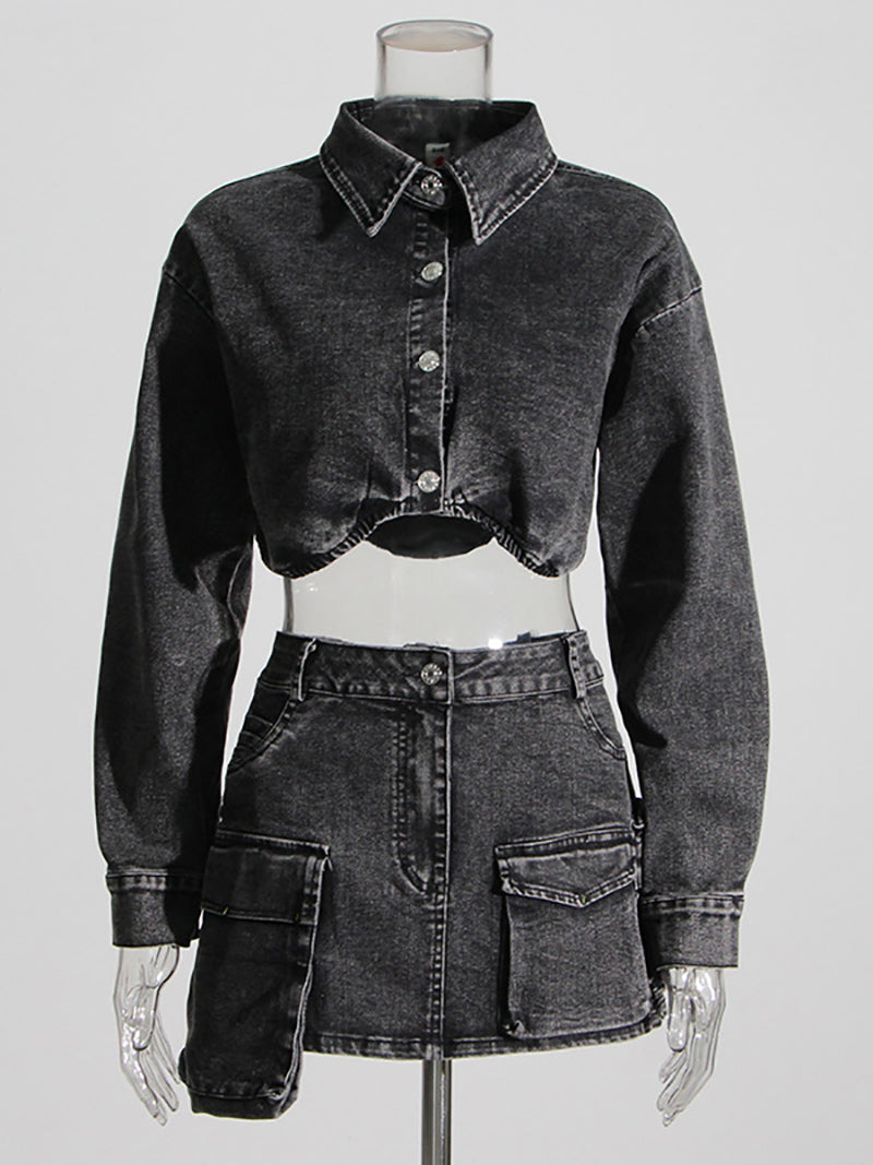A stylish short skirt suit featuring a classic denim jacket and matching skirt. It's perfect for any occasion - comfortable and chic. Our high-quality fabric ensures this outfit is sure to make you look and feel your best.