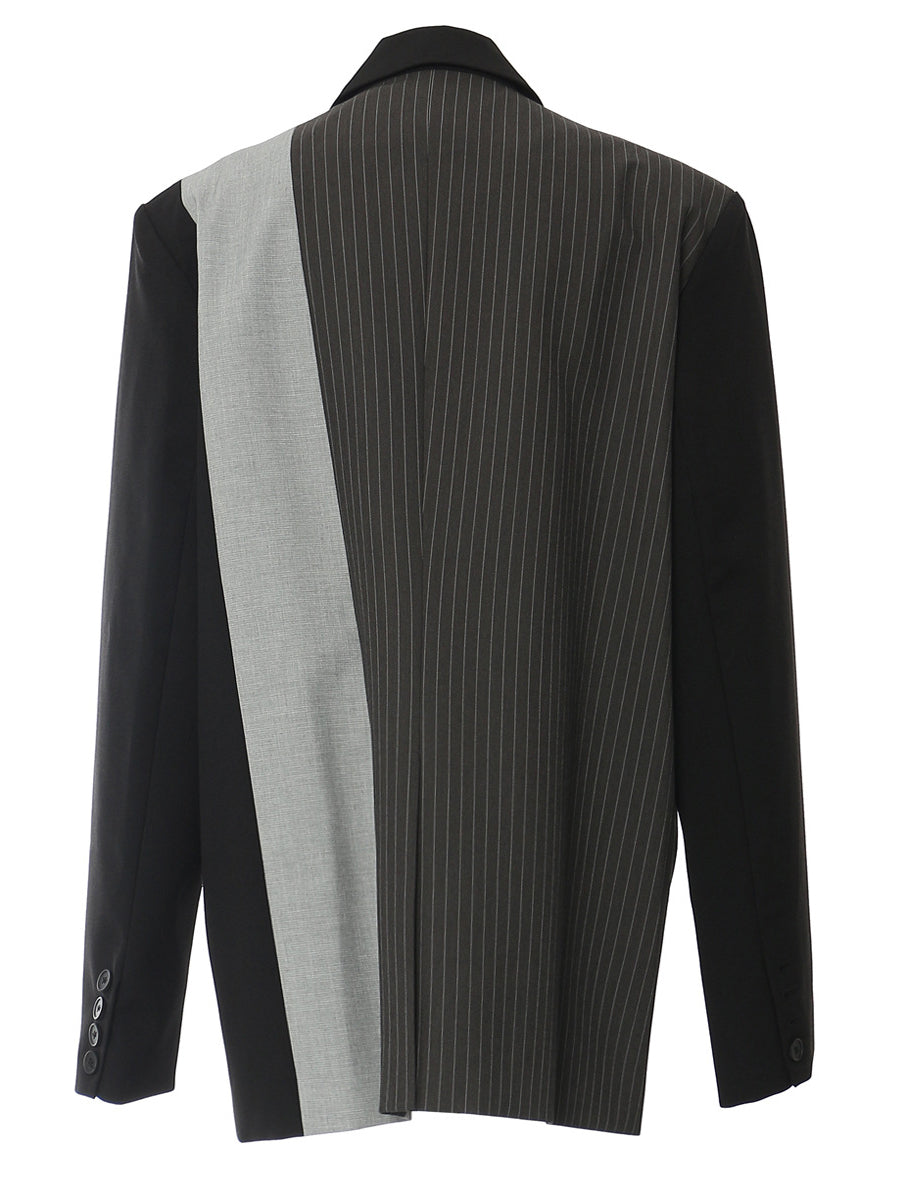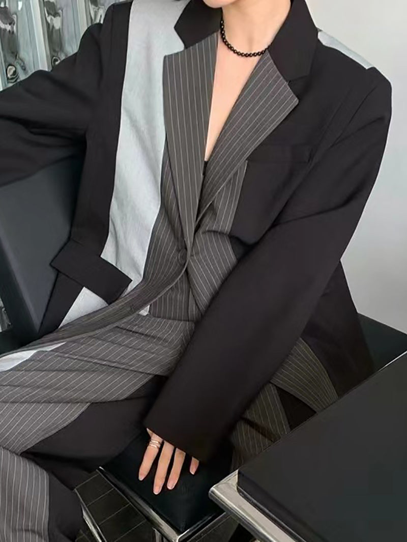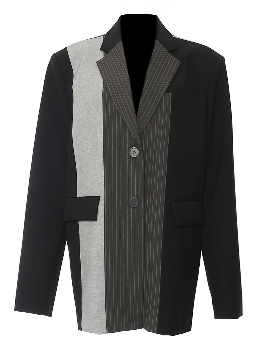 # Fashion Lapel Stripe Patchwork Blazer Elevate your wholesale collection with this contemporary blazer featuring a striking lapel design and bold stripe patchwork detailing. The mixed fabric composition creates visual interest while maintaining a polished, professional silhouette perfect for modern retailers. Versatile enough for both casual and business-casual markets, this piece offers excellent margin potential with its on-trend aesthetic. Quality construction ensures durability through repeated wear and washing cycles. Available in multiple colorways to meet diverse customer preferences and seasonal demands. An ideal staple for boutiques and department stores seeking distinctive outerwear options.
