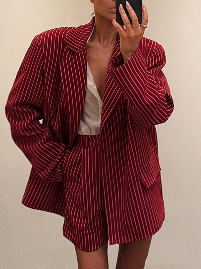 Fashion Loose Stripe Blazer Shorts Two Piece Sets Elevate your wholesale inventory with this versatile two-piece ensemble featuring a relaxed-fit striped blazer paired with coordinating shorts. The loose silhouette offers comfortable all-day wear while maintaining a polished, put-together aesthetic. Perfect for retailers seeking trendy separates that appeal to fashion-forward customers. Quality construction ensures durability through multiple wears and washes. Mix-and-match styling options maximize customer appeal and repeat purchases. Ideal for boutiques, department stores, and online retailers looking to stock contemporary casual-to-business-casual pieces.