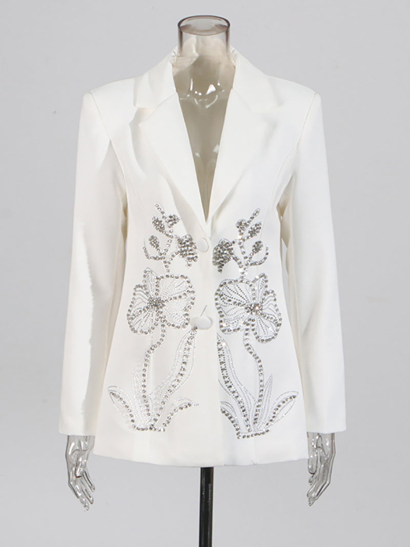 Wholesale this stunning Rhinestone Flower Design Slim Blazer for a touch of elegance to any outfit. The blazer features a beautiful water-diamond design that adds a touch of sparkle, making it perfect for any special occasion. Step out in style and make a statement with this blazer.