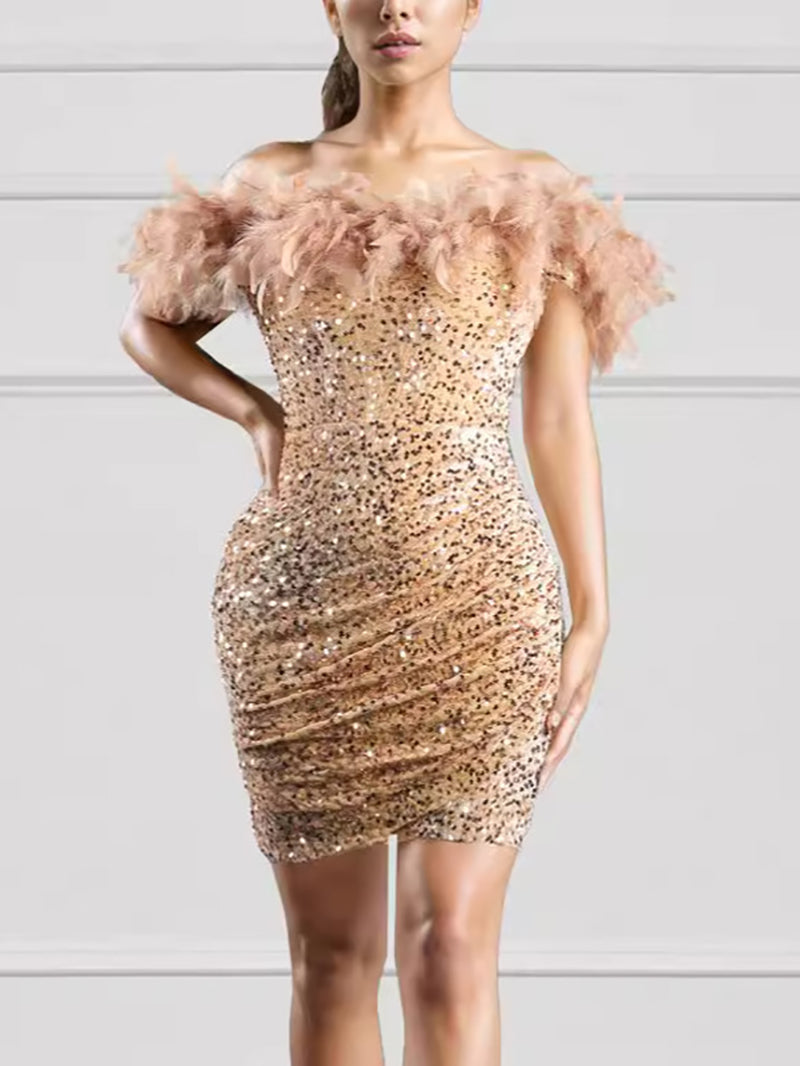 Elevate your club attire with this stunning Sequin Off Shoulder Pleated Mini Dress. Made by a reputable Chinese manufacturer, this bodycon dress offers unbeatable value and quality. The off shoulder design and pleated texture add a touch of glamour to your night out. Wholesale available.