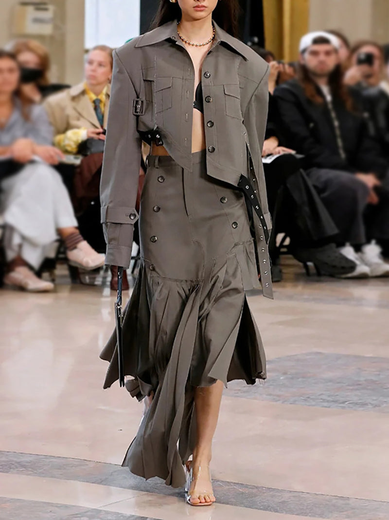 Wholesale solid jacket and irregularity high waist skirt set offers a unique and stylish look. Designed with a high value-to-price ratio, this set is perfect for those looking to make a statement without breaking the bank. Elevate your wardrobe with this must-have fashion piece.