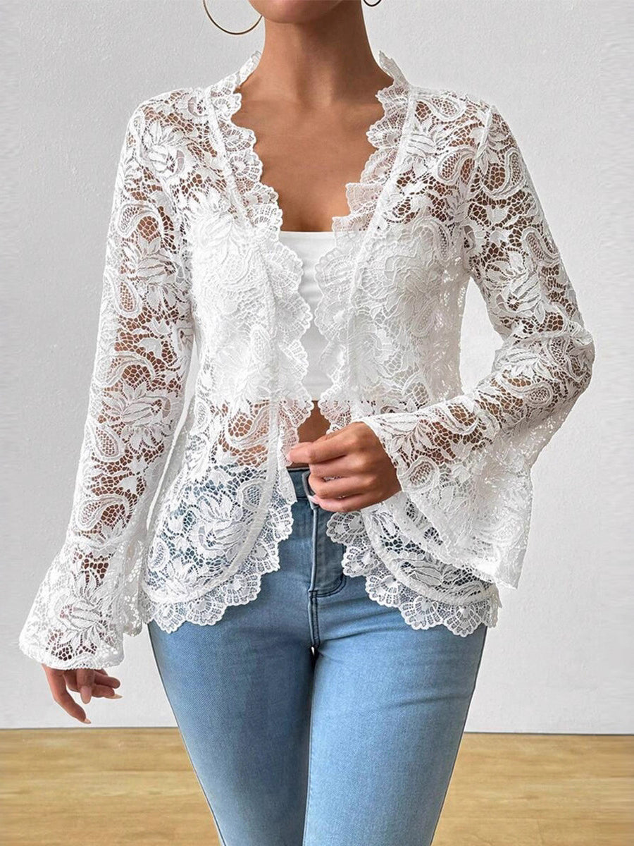 This Casual Flare Sleeve Ruffle Trim Sheer Lace Jacket features delicate lace fabric with a lightweight, sheer design, making it ideal for layering. The flare sleeves and ruffle trim add a stylish touch that enhances any casual outfit, providing both comfort and elegance. Perfect for wholesale buyers looking to offer versatile, trendy pieces.