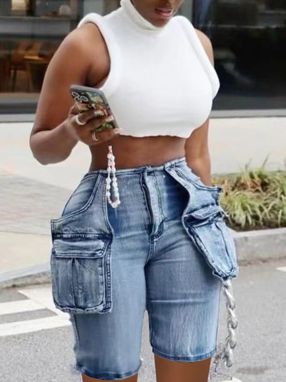 Casual High Waist Stretch Cargo Denim Shorts