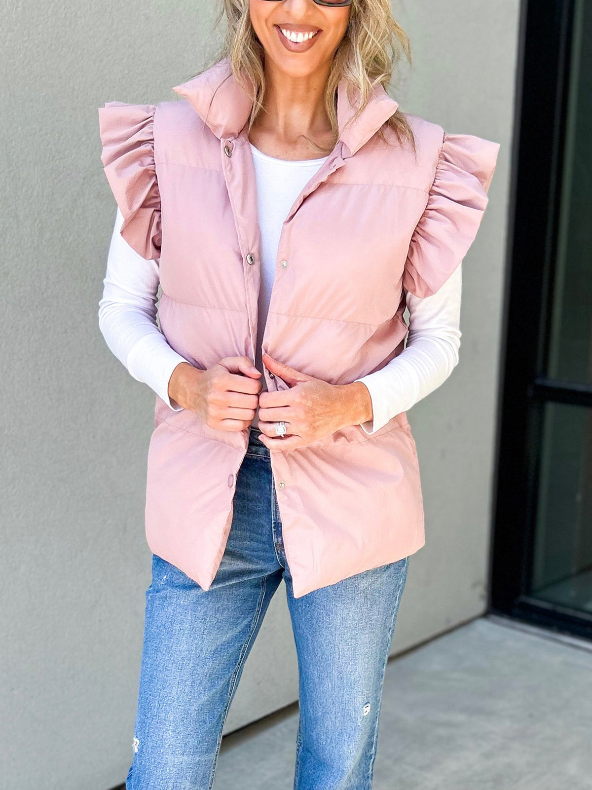 This Casual Ruffles Sleeve Cotton Vest Coat is essential for winter! Made with breathable cotton fabric, this timeless design is comfortable and stylish. Featuring ruffles sleeves and a relaxed fit, it is both chic and cozy. Make a statement in this perfect layering piece!