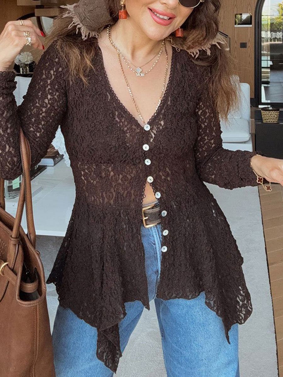 This Elegant Lace V Neck Button Up Ruffles Slim Blouse combines delicate lace detailing with a slim, flattering cut. Featuring a classic V-neck and button-up front, it offers a refined look with subtle ruffles that add a touch of sophistication. Perfect for upscale retail or boutique collections, this blouse appeals to customers seeking stylish, elegant apparel with quality craftsmanship.