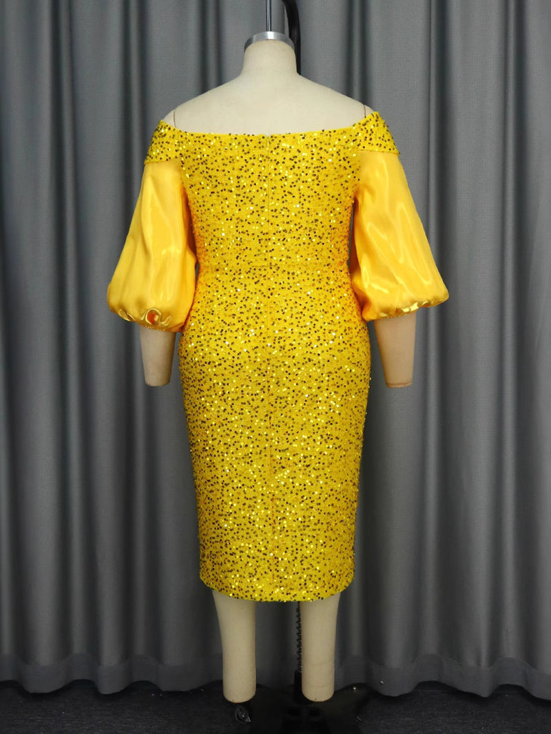# Elegant Off Shoulder Sequin Puff Sleeve Party Mid Dress Make a stunning statement at any event with this sophisticated party dress. Featuring an elegant off-shoulder neckline and eye-catching sequin detailing, this piece combines glamour with wearability. The voluminous puff sleeves add contemporary flair while the midi length offers versatility for various occasions. Perfect for wholesale buyers seeking quality pieces that appeal to fashion-forward customers. The sequin embellishments catch light beautifully, ensuring your clients stand out at celebrations, cocktail events, or special gatherings. A reliable choice for retailers looking to stock dresses that balance trend-conscious design with timeless elegance.