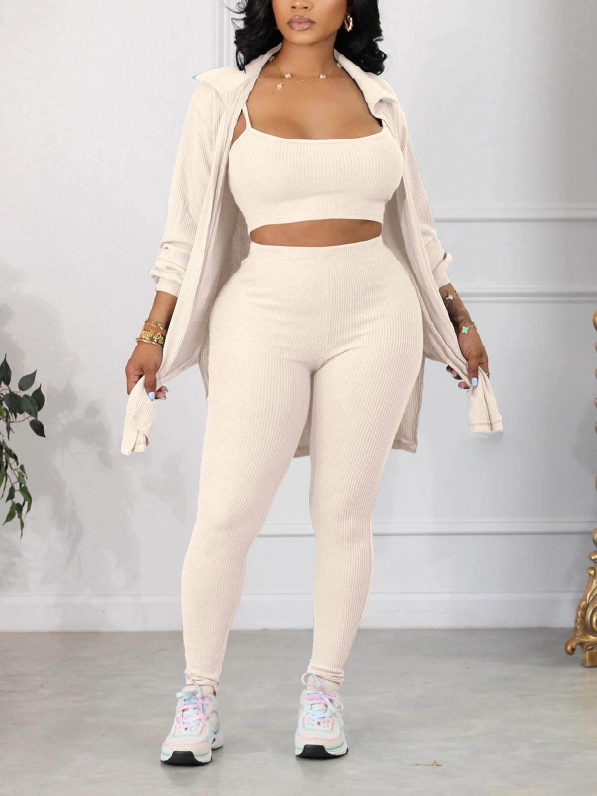 This three piece set offers a stylish and laid-back aesthetic, perfect for any casual occasion. Made with high-quality materials, it combines fashion and comfort for a versatile and modern look. Elevate your wardrobe with this must-have set that effortlessly blends style and relaxation.