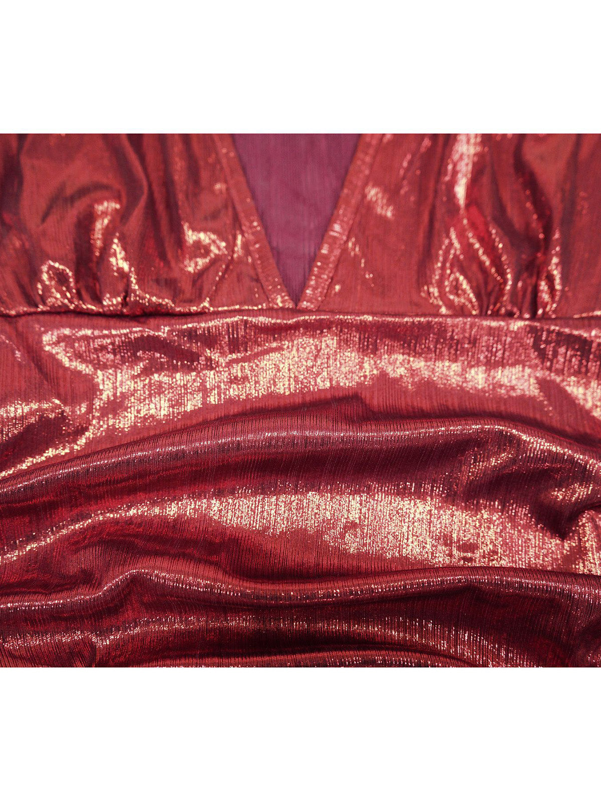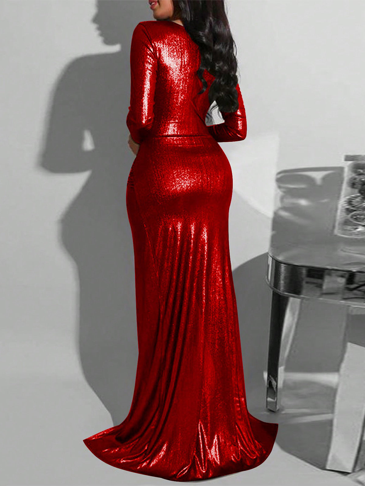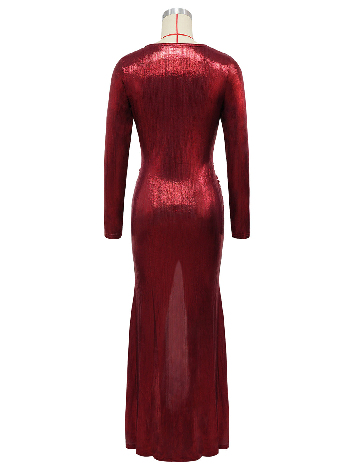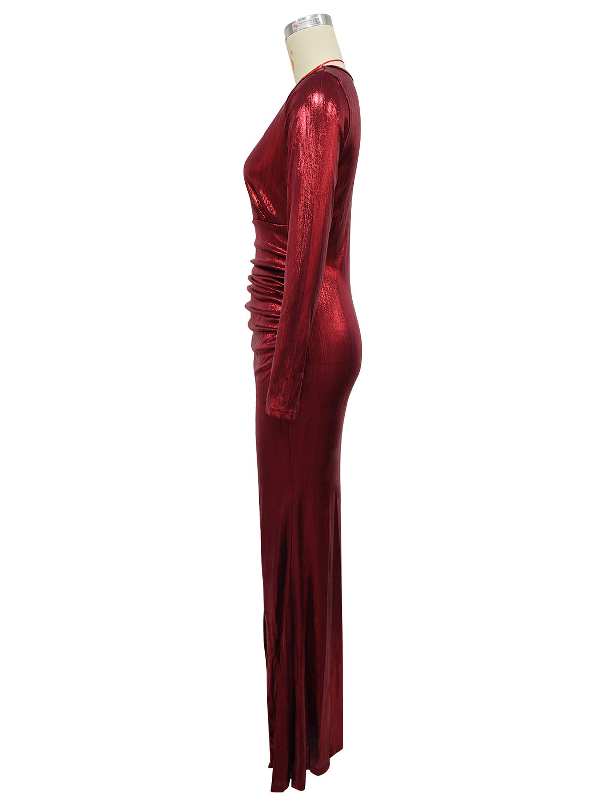 # Fashion Metallic Color Deep V Ruched High Slit Dress Make a bold statement with this striking metallic dress designed for wholesale appeal. Featuring a flattering deep V neckline and strategic ruching that sculpts the silhouette, this piece combines sophistication with modern edge. The high slit adds movement and allure, perfect for evening events or upscale occasions. The lustrous metallic finish catches light beautifully, ensuring your customers stand out. Ideal for retailers seeking versatile, trend-forward pieces that deliver premium appeal at competitive wholesale pricing.