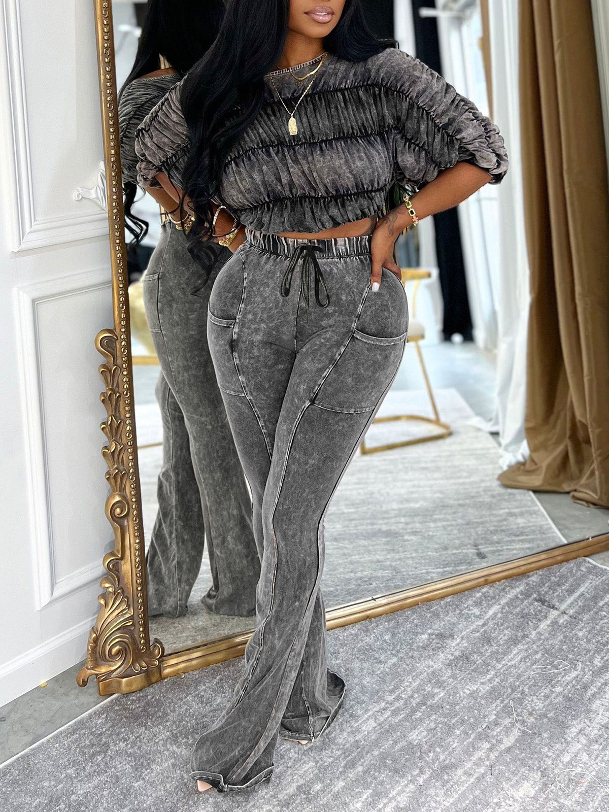 # Fashion Ruched Crop Top and Lounge Pant Sets Elevate your loungewear collection with this versatile two-piece set. The ruched crop top features flattering gathering details that enhance the silhouette, while the comfortable lounge pants offer relaxed fit and breathability. Perfect for casual wear, at-home comfort, or layering. Available in multiple colorways to suit diverse customer preferences. Ideal for wholesale buyers seeking trendy, affordable pieces that appeal to fashion-conscious consumers seeking style without compromising comfort.