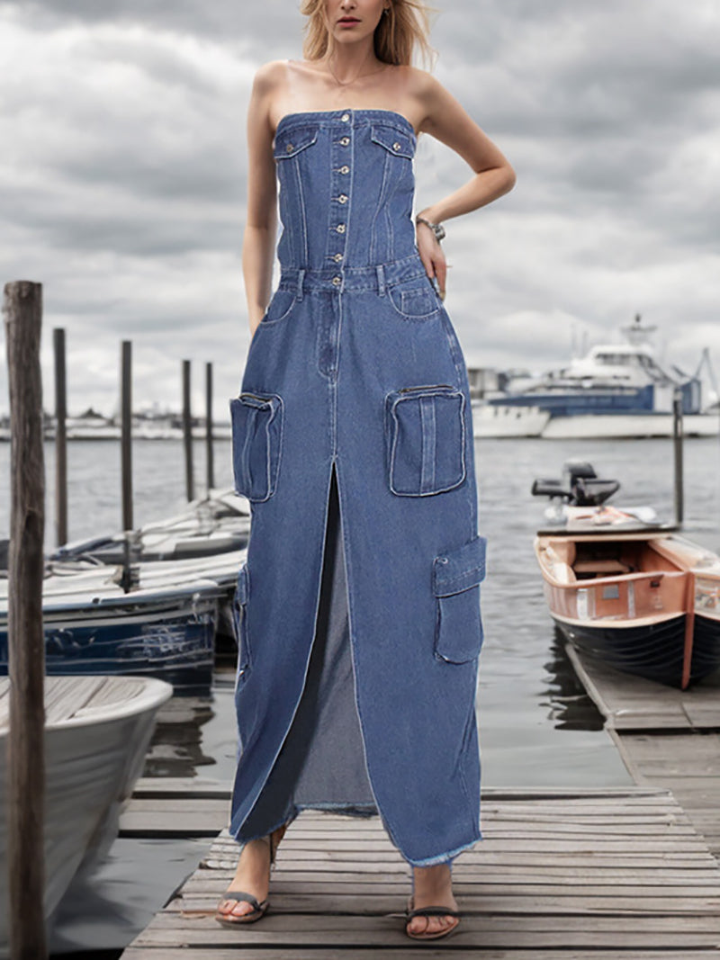 As a wholesaler, we offer the Fashion Slit Fitted Cargo Denim Tube Dress at a great value. This dress combines style and functionality with its cargo pockets and fitted silhouette, making it a practical and fashionable choice for any occasion.