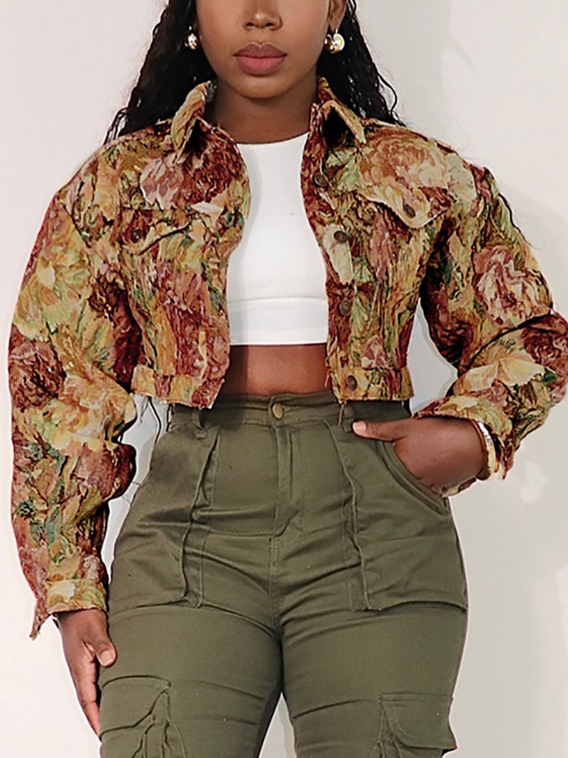 This vintage-style cropped jacket features a jacquard pattern and button closure, combining timeless fashion with modern flair. Its structured design offers a polished look ideal for a variety of occasions, making it a versatile addition for wholesale buyers seeking classic yet trendy outerwear options.