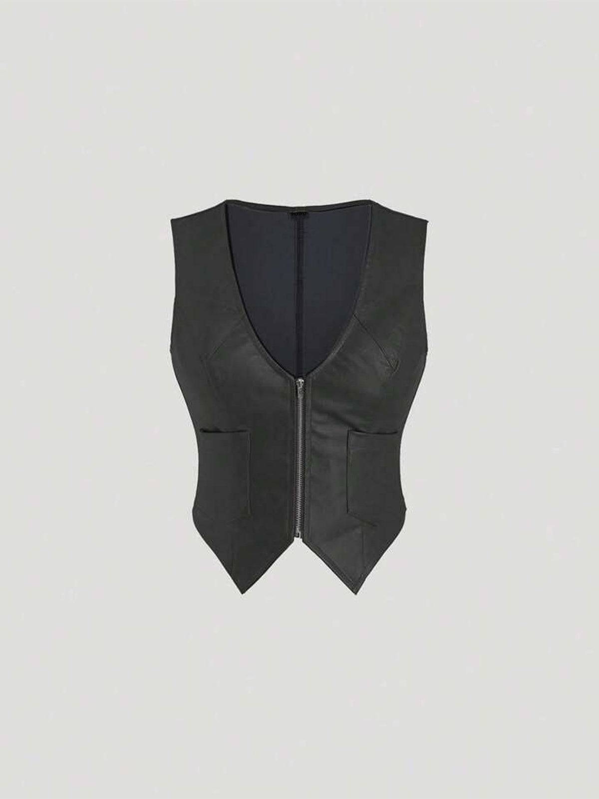 Faux Leather V-neck Solid Zipper Blazer Crop Vest
