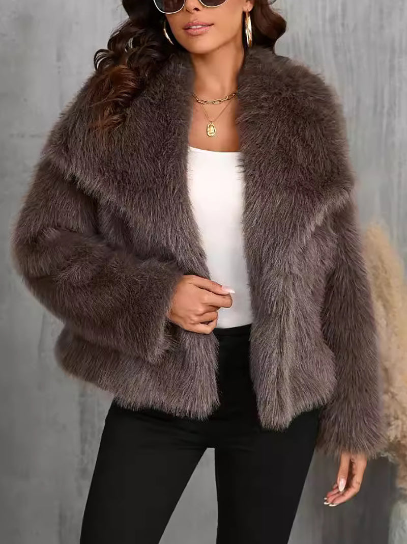 This wholesale Fluffy Turn Lapel Faux Fur Warm Coat features a large, plush collar for added warmth and style. Stay cozy and chic with this faux fur coat.