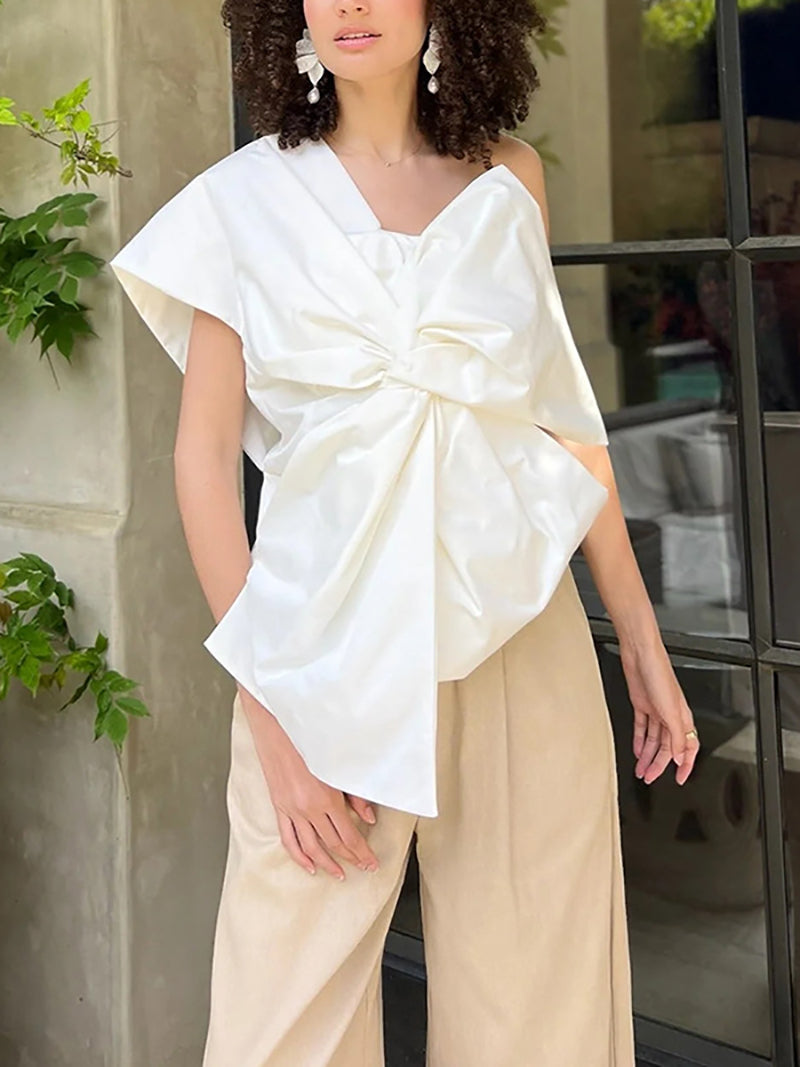 Wholesale: Make a statement with our One Shoulder Asymmetry Statement Top. Its unique design features a stylish bow and elegant dress-like top, perfect for any special occasion. Upgrade your wardrobe with this standout piece.