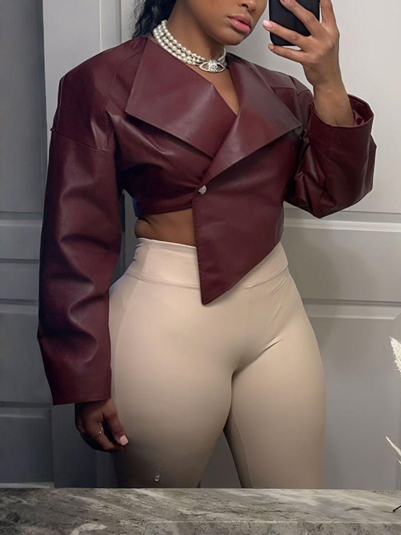This Sexy Cross Neck Irregular PU Leather Crop Jacket features a bold design with an edgy cross-neckline...