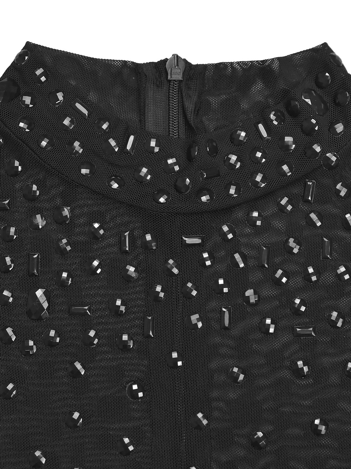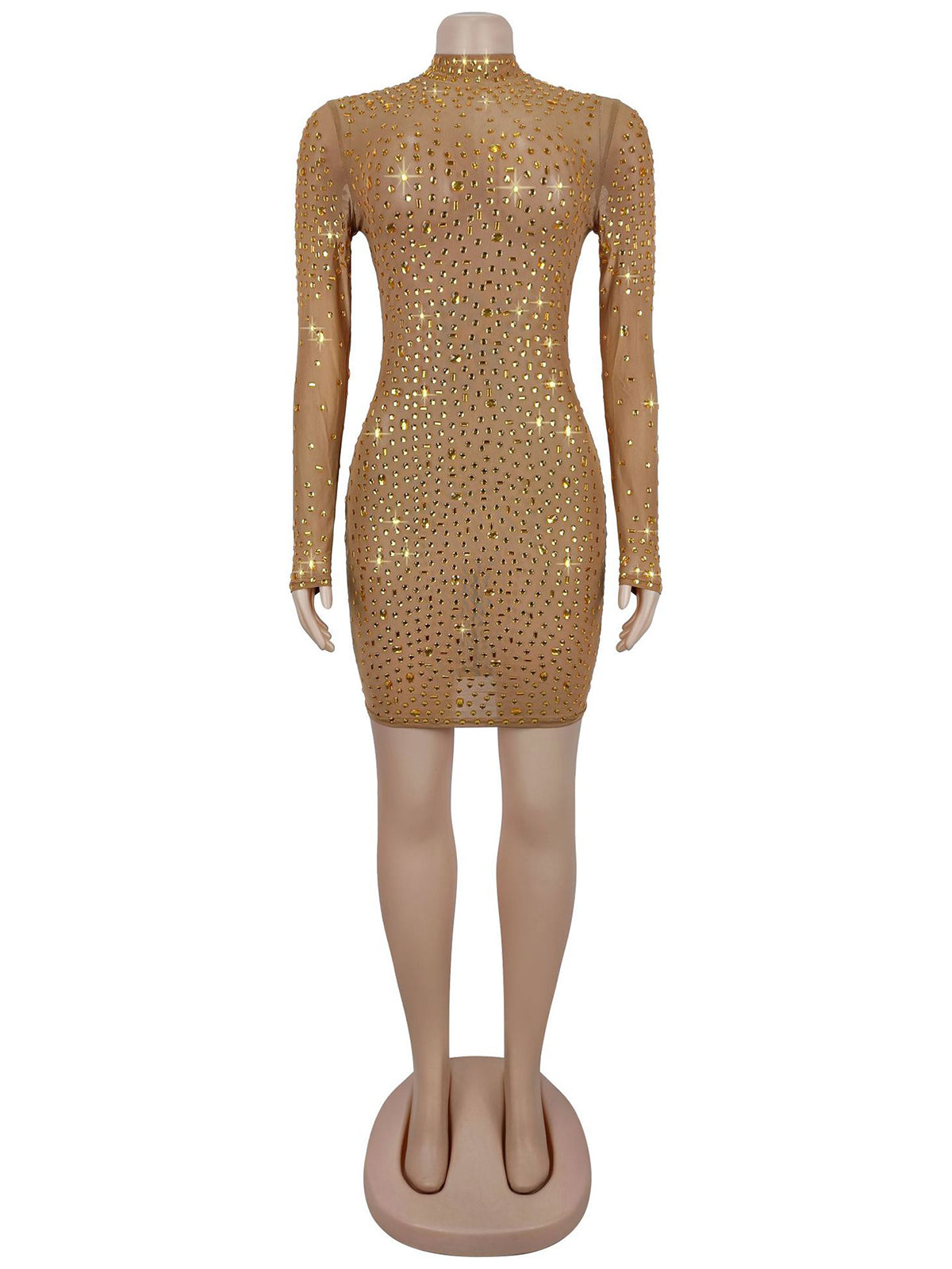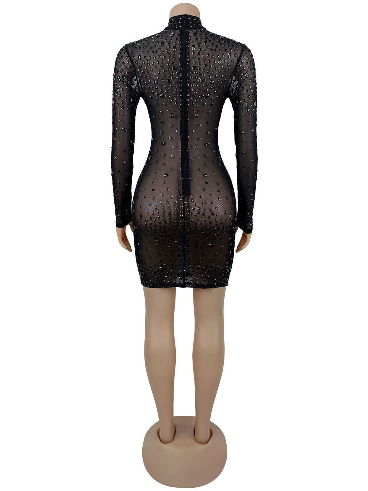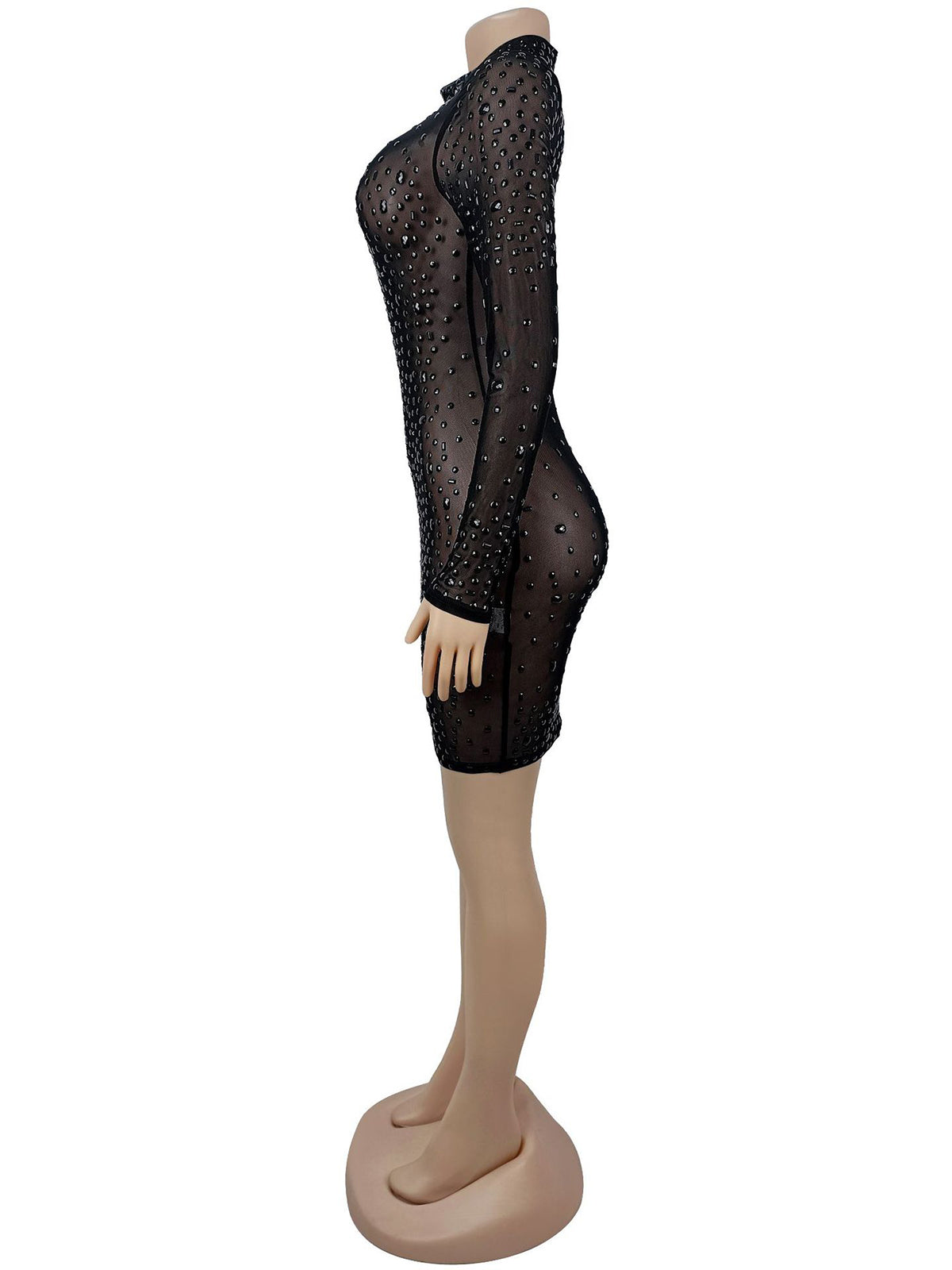 # Sexy Mesh Sheer Rhinestone Mini Dress Elevate your inventory with this stunning mesh mini dress featuring sheer panels and dazzling rhinestone embellishments. The delicate mesh construction creates an alluring silhouette while the strategically placed rhinestones add glamorous sparkle and visual interest. Perfect for evening wear, club outings, or special occasions, this piece combines contemporary design with eye-catching details. The fitted mini length flatters the figure and makes a bold fashion statement. Ideal for retailers seeking trendy, statement-making pieces that appeal to fashion-forward customers seeking premium quality and distinctive style.