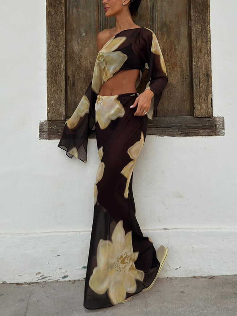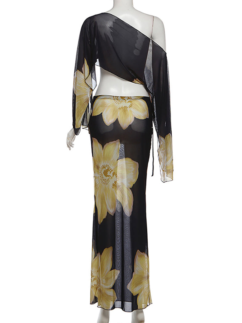 # Sexy Print Mesh Off Shoulder Top Maxi Skirt Set Make a bold statement with this two-piece ensemble featuring a striking printed mesh off-shoulder top paired with a flowing maxi skirt. The off-shoulder design creates an alluring silhouette while the sheer mesh fabric adds contemporary flair. Perfect for retailers seeking trendy pieces that appeal to fashion-forward customers. This set combines comfort with style, offering versatile styling options for various occasions. The coordinated print throughout ensures a polished, put-together look straight from the package. Ideal for wholesale buyers looking to stock pieces that deliver both visual impact and wearability.