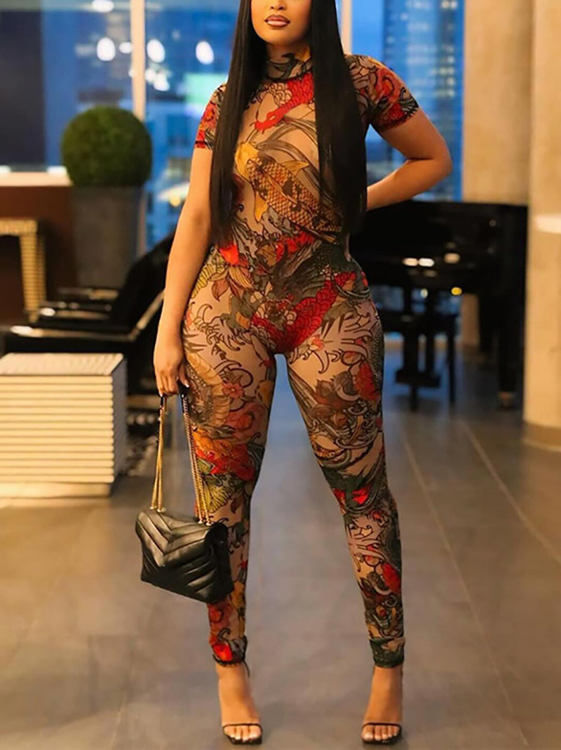 Sexy Print See Through Mesh Bodycon Jumpsuit