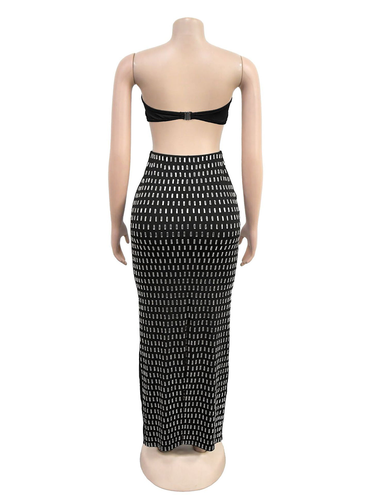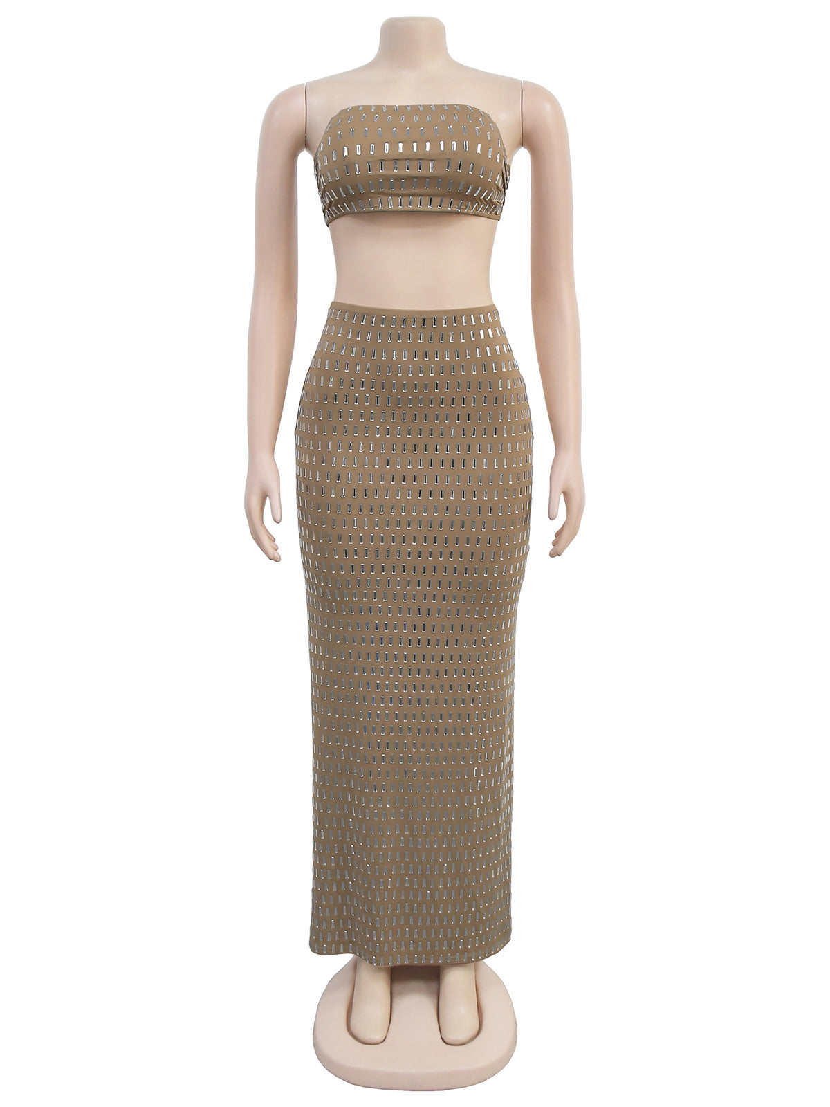 # Sexy Rhinestone Wrap Chest And Maxi Skirt Set Make a bold statement with this eye-catching two-piece ensemble. The wrap chest piece features dazzling rhinestone embellishments that catch the light beautifully, while the flowing maxi skirt offers elegant coverage and movement. Perfect for evening events, performances, or special occasions, this set combines glamorous sparkle with sophisticated silhouettes. The rhinestone detailing adds luxury appeal, making it an ideal choice for wholesale buyers seeking standout pieces that command attention. Versatile styling options allow customers to wear each piece separately or together for maximum impact.