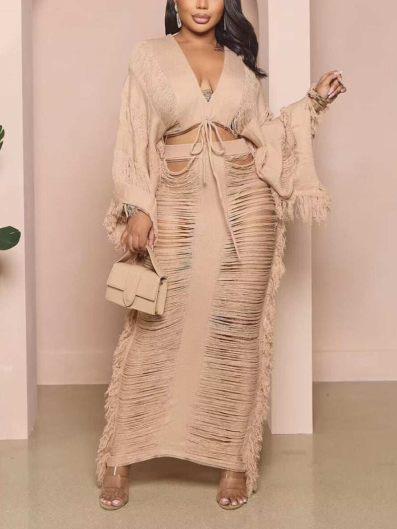 This V Neck Long Sleeve Knit Skirt Two-piece Set features an alluring and elegant design that will have you looking and feeling confident all day. With its comfortable fabric and figure-flattering silhouette, this set is perfect for elevating any look.