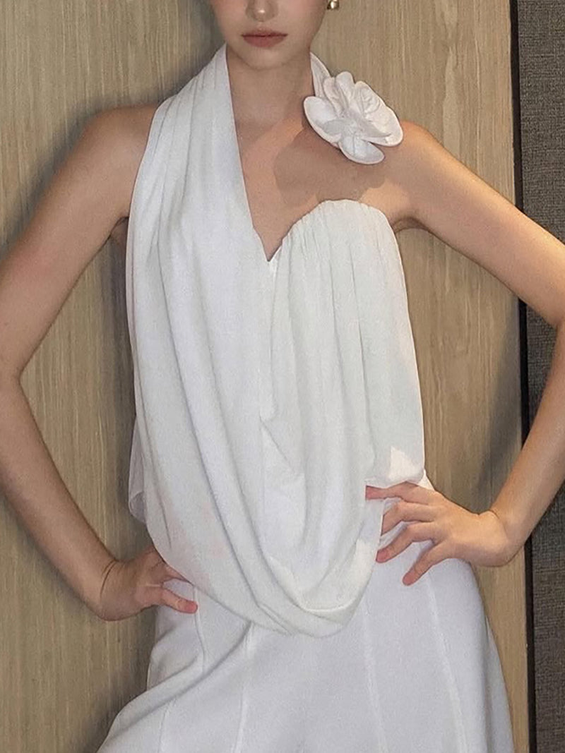 This backless halter top offers a cute and unique flower design, perfect for adding a touch of fun to your outfit. Plus, its asymmetrical cut gives it a modern and stylish look. With its great value, this top is a must-have for any fashion-forward individual.