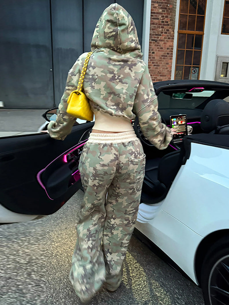 # Camo Print Hooded Cropped Jacket Sweatpants Set Make a bold statement with this two-piece camo set designed for wholesale appeal. The cropped hooded jacket features a relaxed fit with functional drawstrings, while the matching sweatpants offer comfort and style. The classic camouflage print works across multiple seasons and customer demographics. Perfect for retailers looking to stock versatile, on-trend pieces that combine casual comfort with contemporary aesthetics. Quality construction ensures durability through repeated wear and washing.