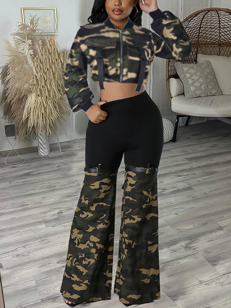 Wholesale the camo cropped jacket and pants denim set for high profits. This versatile set is perfect for a trendy, edgy look. Stay stylish while making a profit!