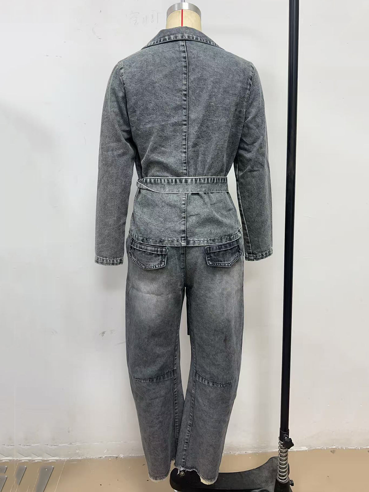 # Casual Belted Denim Jacket And Wide Leg Jeans Set This versatile two-piece denim collection offers wholesale buyers a complete styling solution. The structured belted jacket features classic denim construction with a cinched waist for a flattering silhouette, while the coordinating wide-leg jeans provide contemporary comfort and movement. Perfect for retailers seeking coordinated sets that appeal to fashion-conscious customers, this pairing delivers timeless appeal with modern proportions. The quality denim construction ensures durability through repeated wear and washing, making it an excellent value proposition for bulk orders. Ideal for boutiques, department stores, and online retailers looking to stock cohesive outfit options that customers can purchase together or separately.