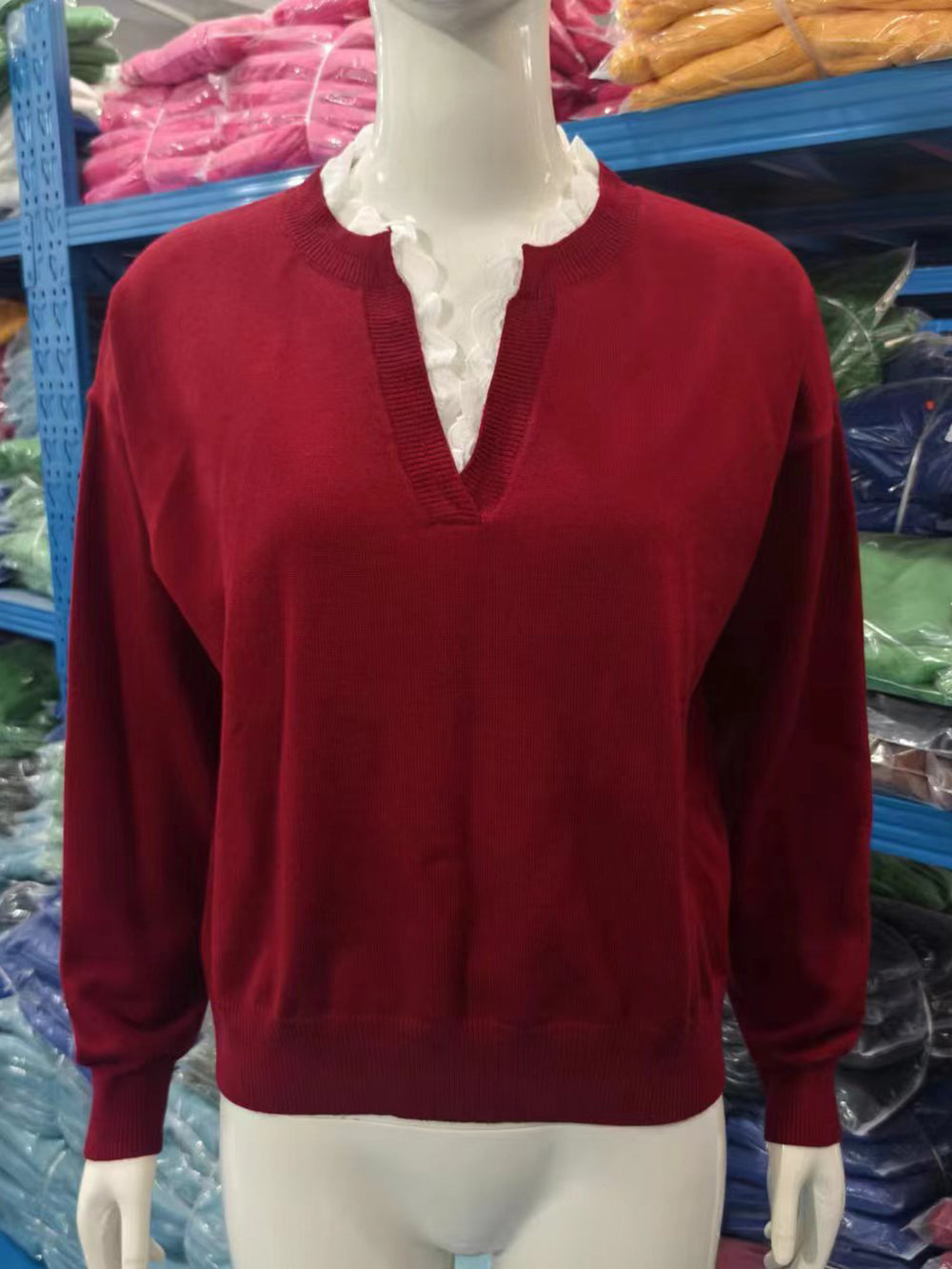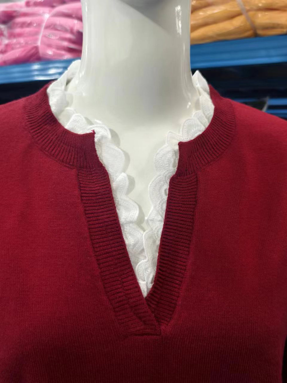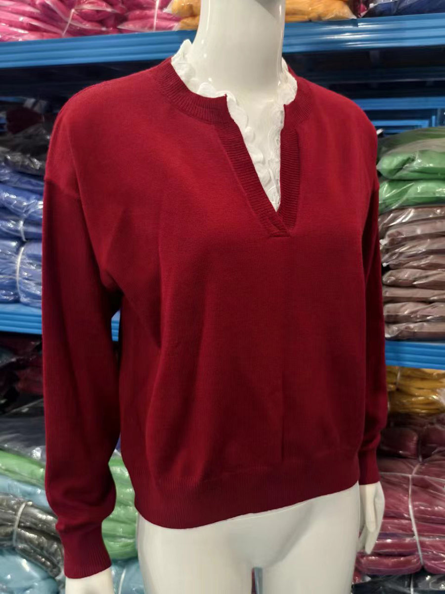 Elevate your wholesale collection with this versatile Casual V Neck Lace Detail Knit Sweater. Featuring a flattering V-neckline and delicate lace accents, this piece combines comfort with contemporary style. Crafted from quality knit fabric, it offers excellent drape and durability for repeat customers. The timeless design works seamlessly across seasons and pairs effortlessly with various bottoms. Perfect for retailers seeking reliable basics that appeal to style-conscious shoppers. Stock this essential sweater to meet consistent demand and maximize profit margins on a customer favorite.