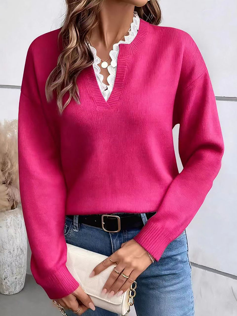 Casual V Neck Lace Detail Knit Sweater