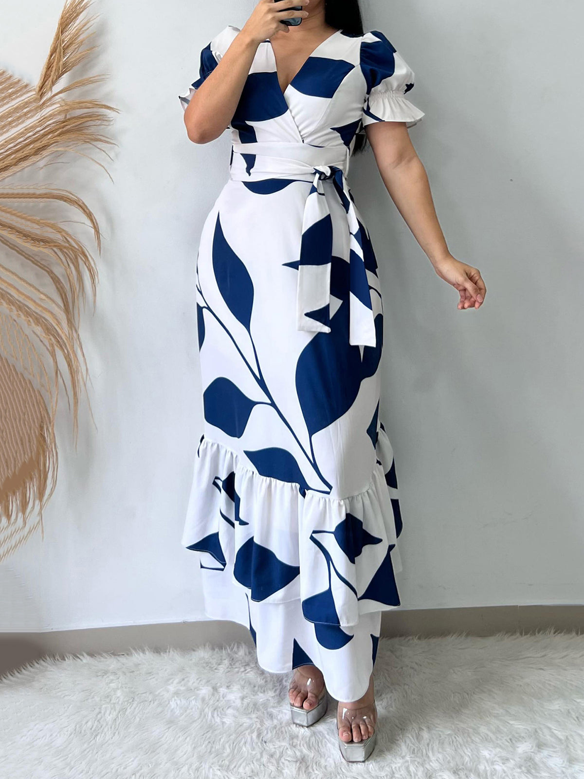This Casual V-neck Print Ruffle Hem Maxi Dress offers high value for the price. Its trendy V-neck design and charming print are perfect for a casual yet stylish look. The ruffle hem adds a touch of femininity, making it a versatile addition to any wardrobe.